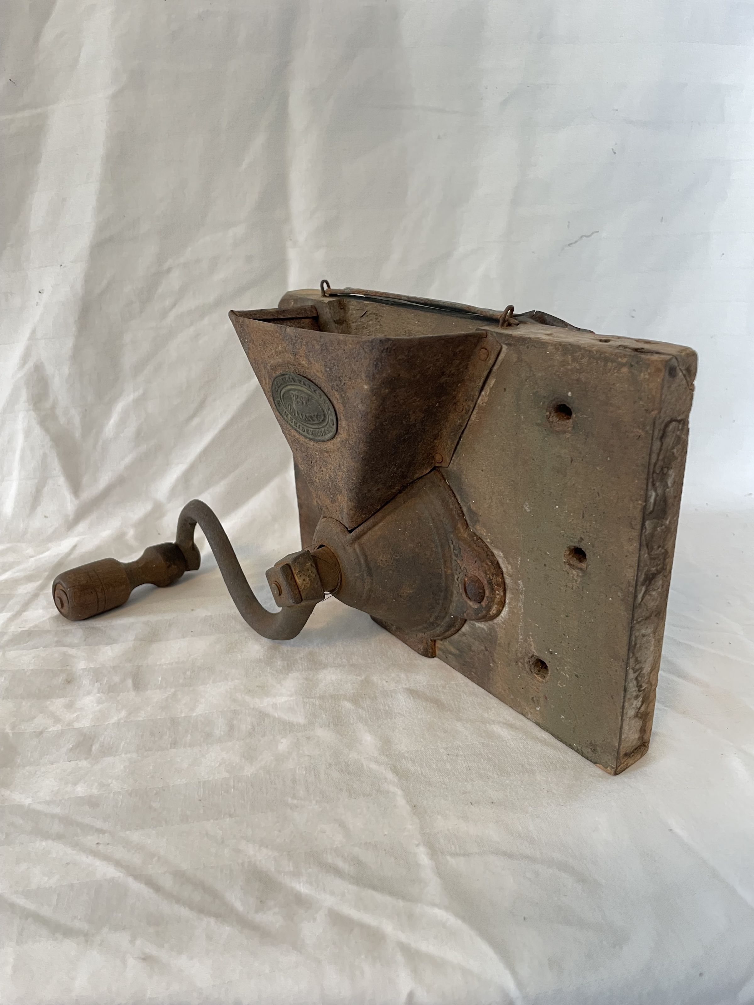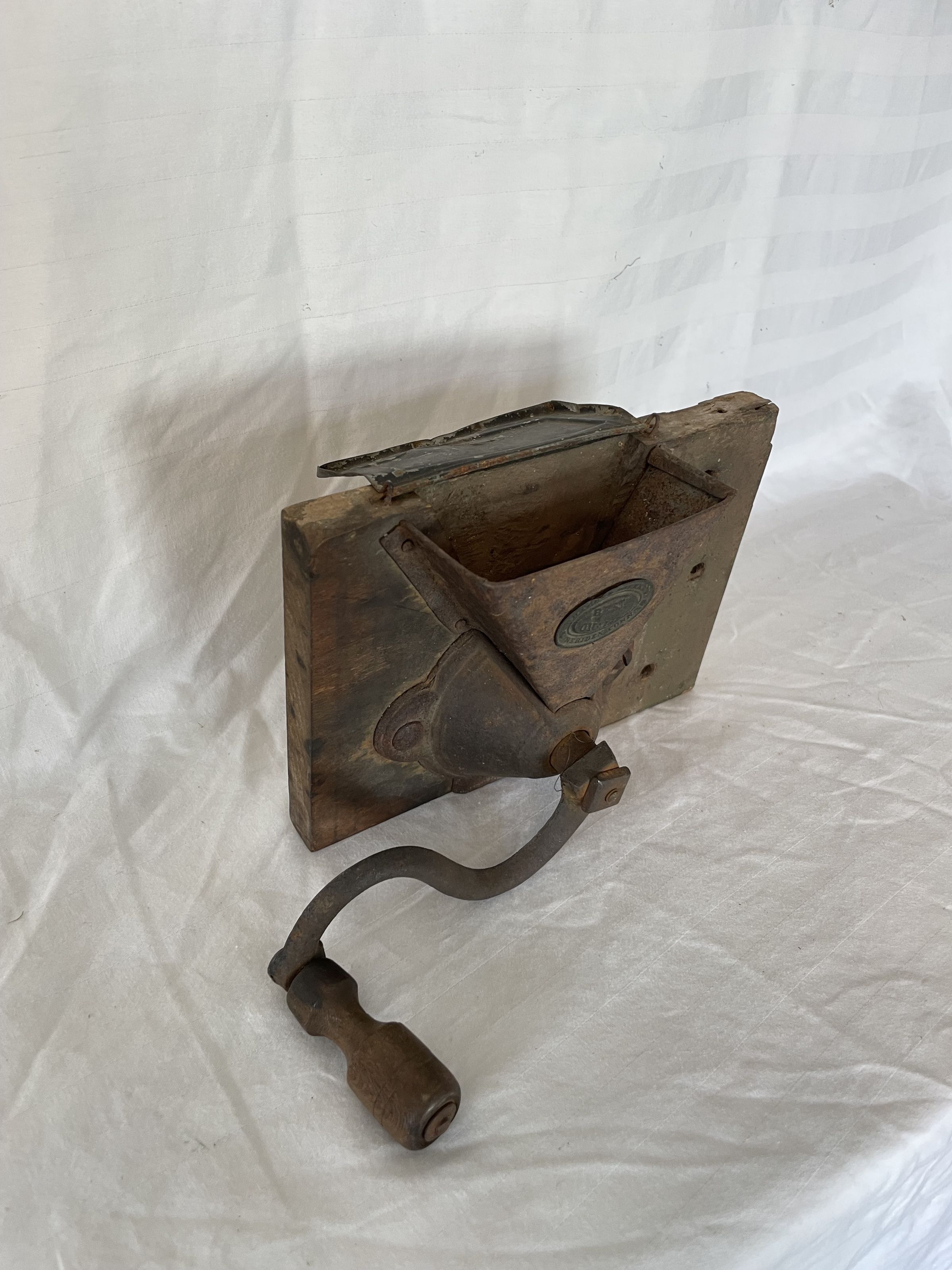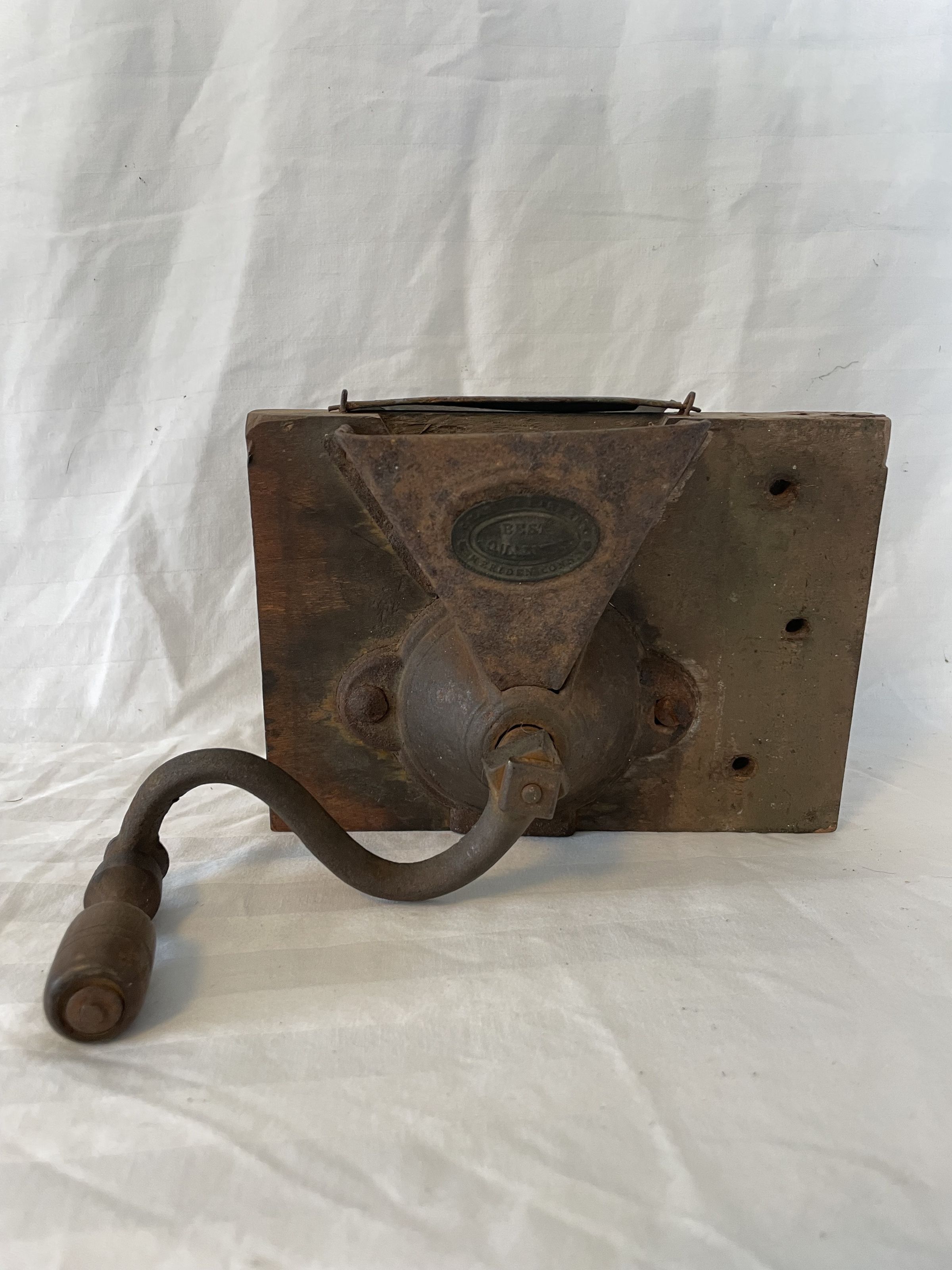 Tin funnel wall mount coffee grinder with cast iron crank. The funnel is engraved with emblem that reads "Charles Parker Best Quality Meriden Conn."