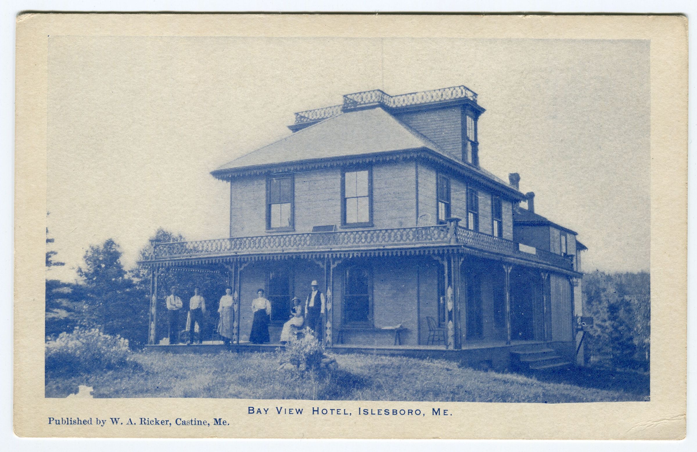 Postcard picture of Bay View Hotel (on Hewes Point) Islesboro, ME Closeup showing 6 people on the veranda.
