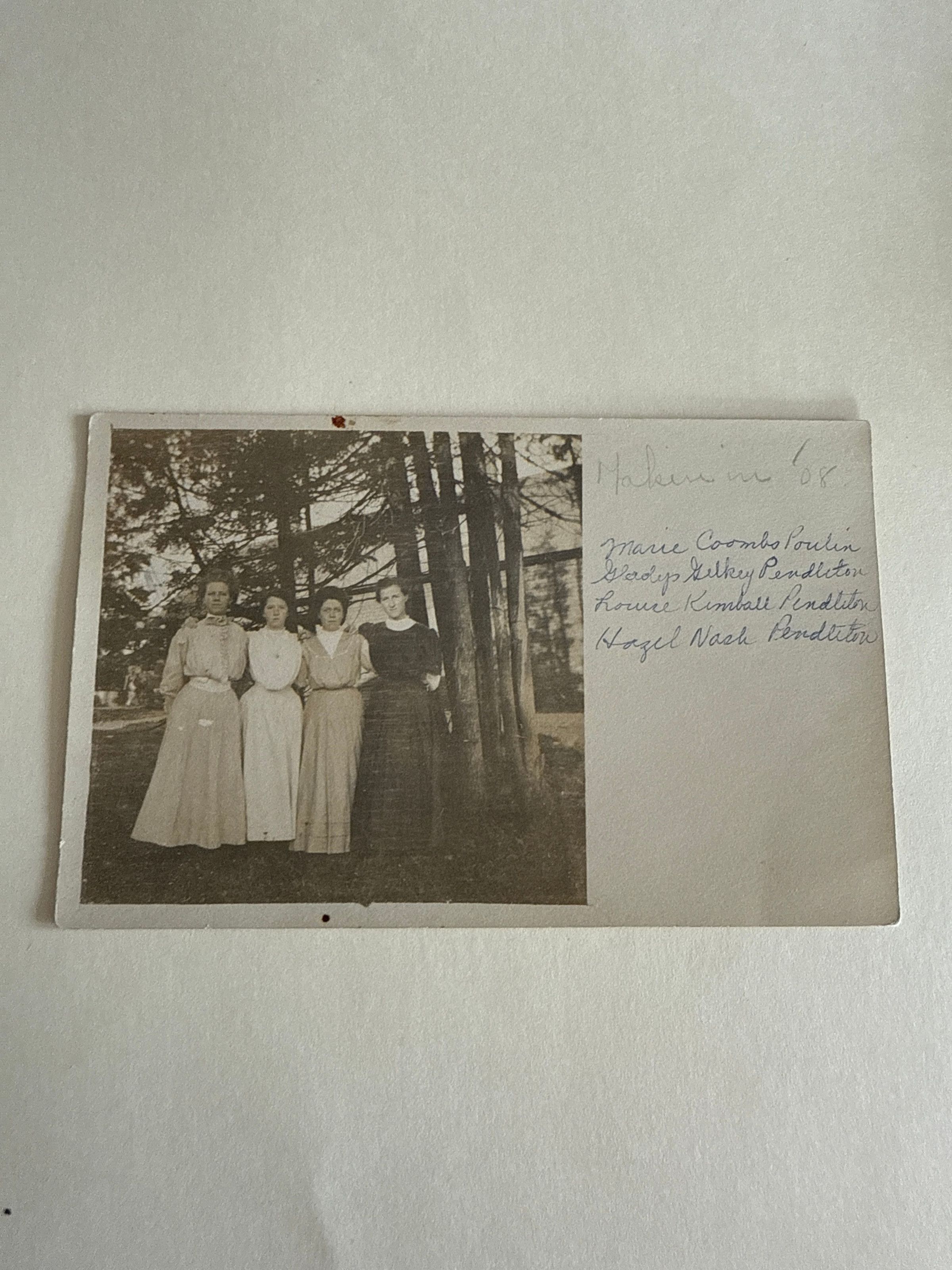 Marie Coombs Poulin (m. Fred Poulin), Gladys Gilkey Pendleton (m Cecil Leland Pendleton, father of Leland), Louise Kimball Pendleton (m. Thomas Chester Pendleton), Hazel Nash Pendleton (m. Elmer Pendleton). Likely were school mates on Islesboro. If this picture was taken in 1908, these girls were the mothers of their namesakes in the 2nd History, whence the marriage data. Either the pencilled id of "Taken in 1908) is wrong or the names are wrong; dresses look like 1908. A mystery.