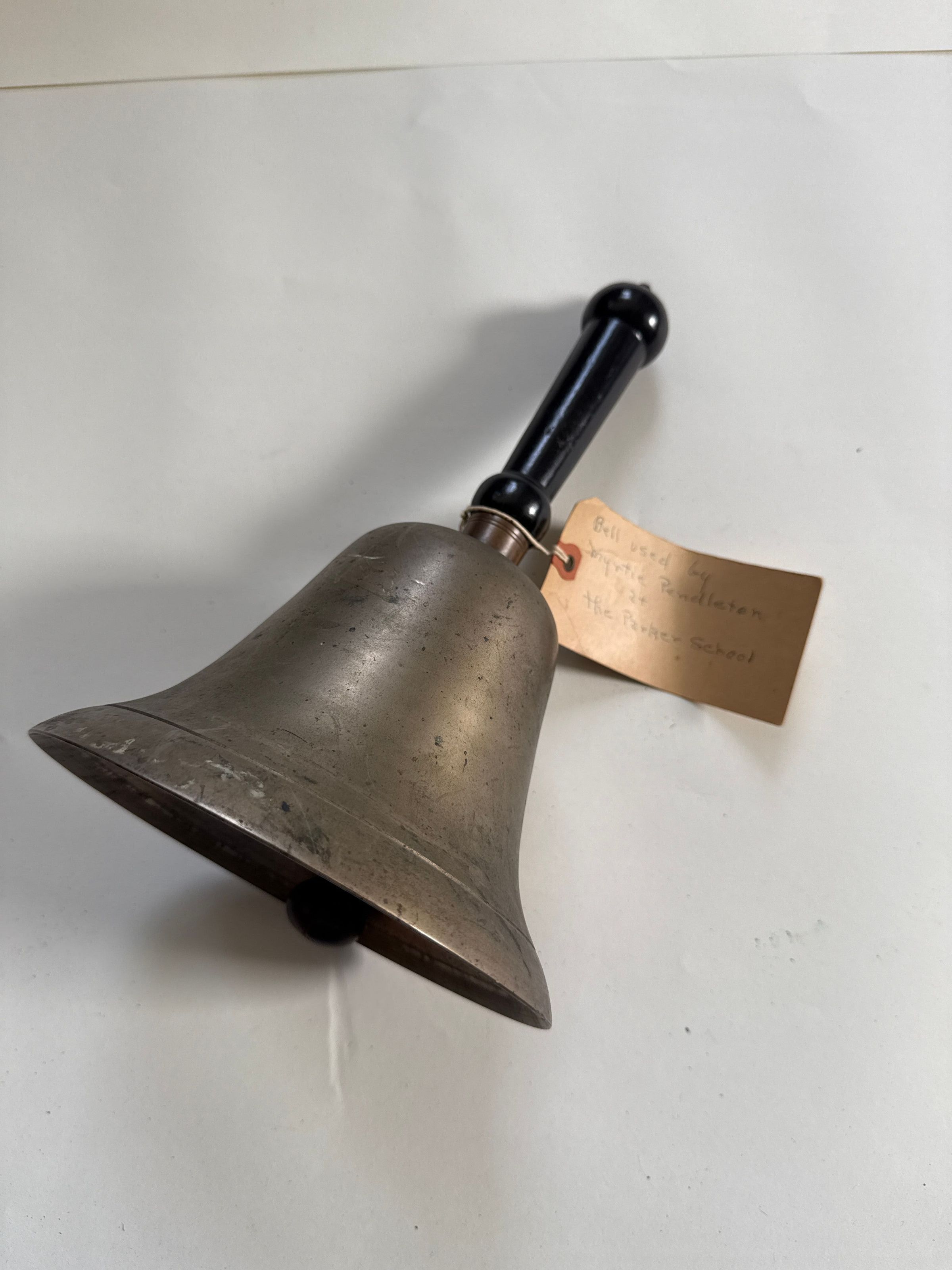 11 1/4 inches x 7 inches (diameter. base of bell). Bell has incised line 3/4 inch from base. Has black wooden handle, 5 3/8 inches long, topped with metal cap. Said to be the bell used by Myrtle Pendleton at the Parker School. Pictures of the Parker School are in the archives. It was located in Pripet at the street-side of John Oldham's driveway.