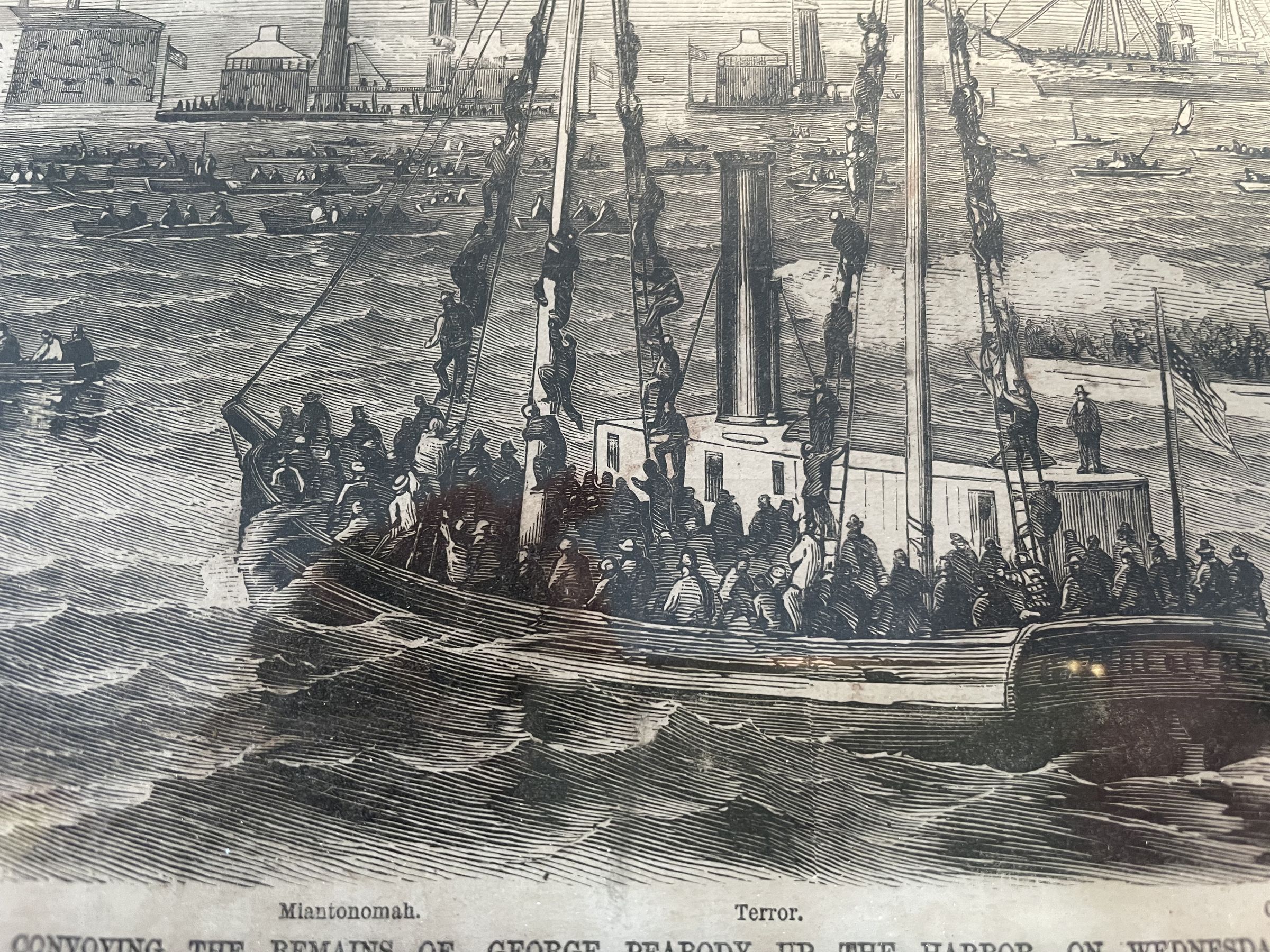 The bottom reads: " Portland, Maine-- The procession of war vessels, as seen from Fort Gorges, Convoying the remains of George Peabody up the harbor on Wednesday AM, January 26th-- From a sketch by our special artist, Joseph Becker'