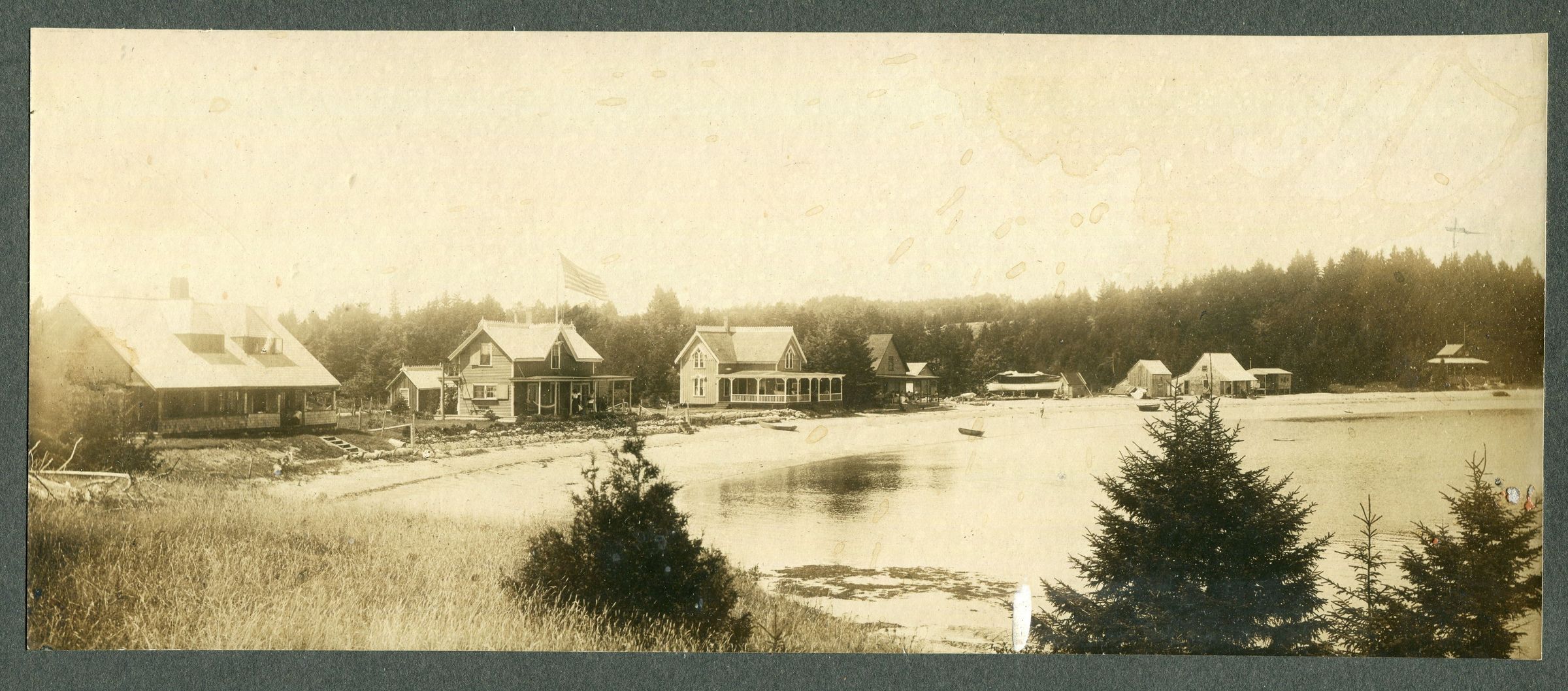Photo, 4" x 9.5" showing cottages off Billy's Shore Road, south end. Mounted on black cardboard 6.25" x 12". Houses identified as r-l: Webster, gone, gone, Creelman, gone, McAllen, gone & replaced by Sue Hatch camp, Deckleman/Grimes, Teresa Thurston.