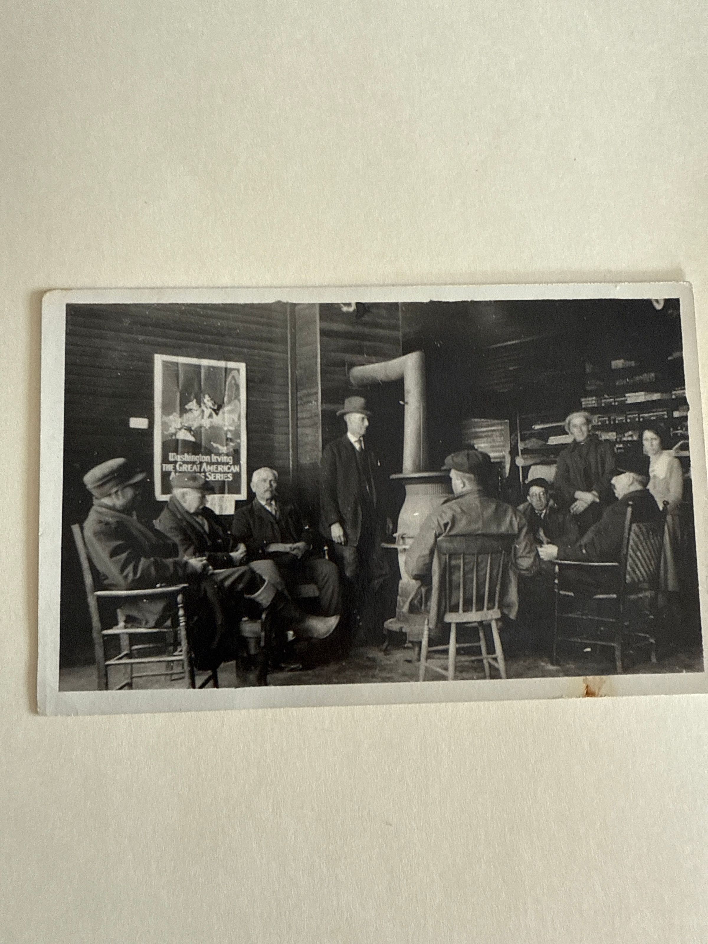 men around stove in Pendleton Store - Ned Pendleton, Jim Pendleton, Len Rolerson, Roderick P.; in chairs N.D. Pendleton, D. Hatch, Rudolph Hatch; standing Burton Crosby, Kath P.