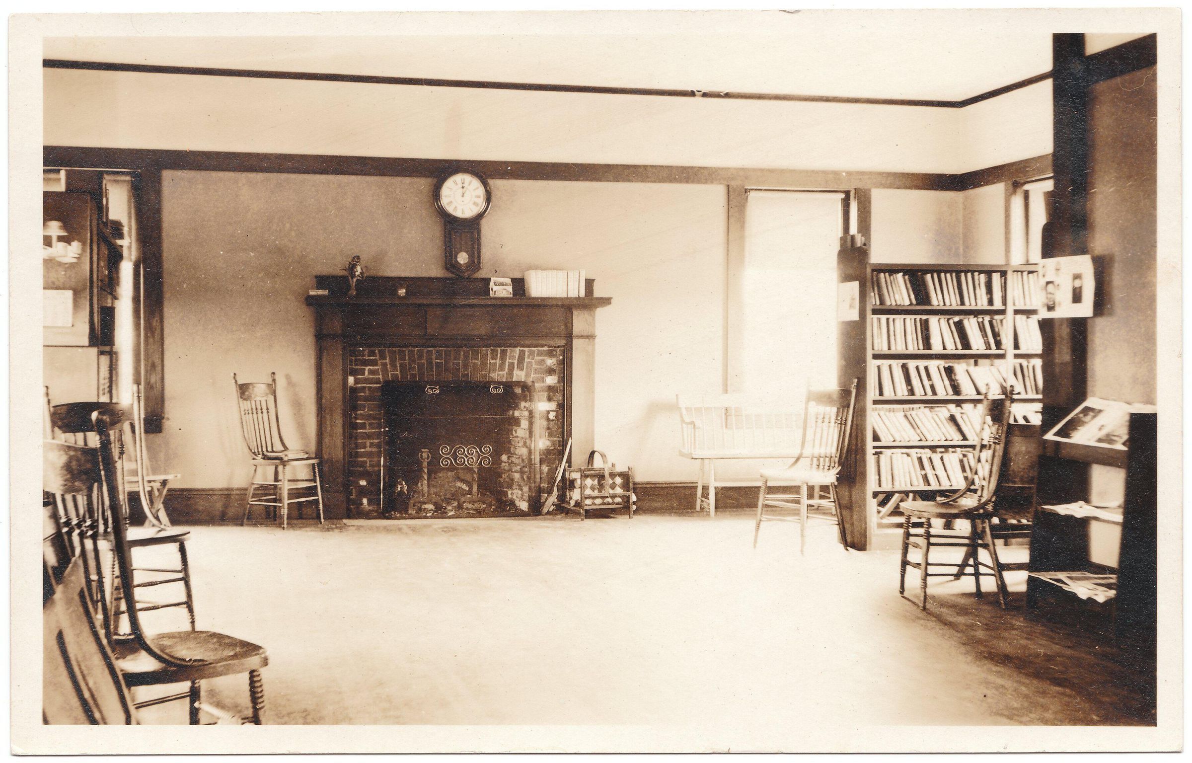 This photograph was taken of the interior of the Islesboro Town Library. It shows a fireplace in the center of the far wall with one stack of shelves and books in the corner, and a number of chairs scattered around the periphery of the room. This photo was referenced and presumably enclosed in a letter by Mrs. Joseph A. Pendleton. The letter was dated October 23, 1921. Therefore the picture has also been assigned that approximate date. The letter also said the photographer was "Guy" (Pendleton?)