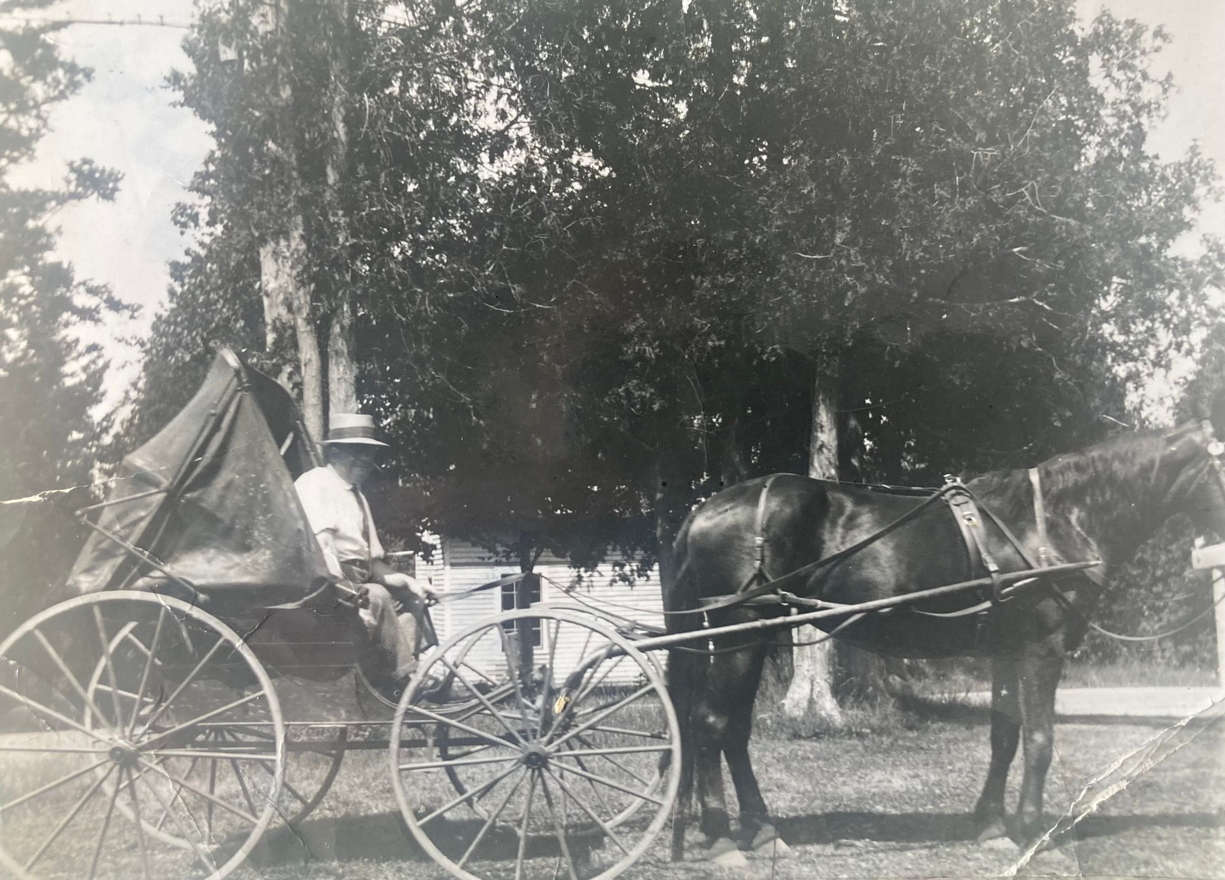 Photograph of horse-and-buggy and their driver (name indecipherable). Circa 1930?
