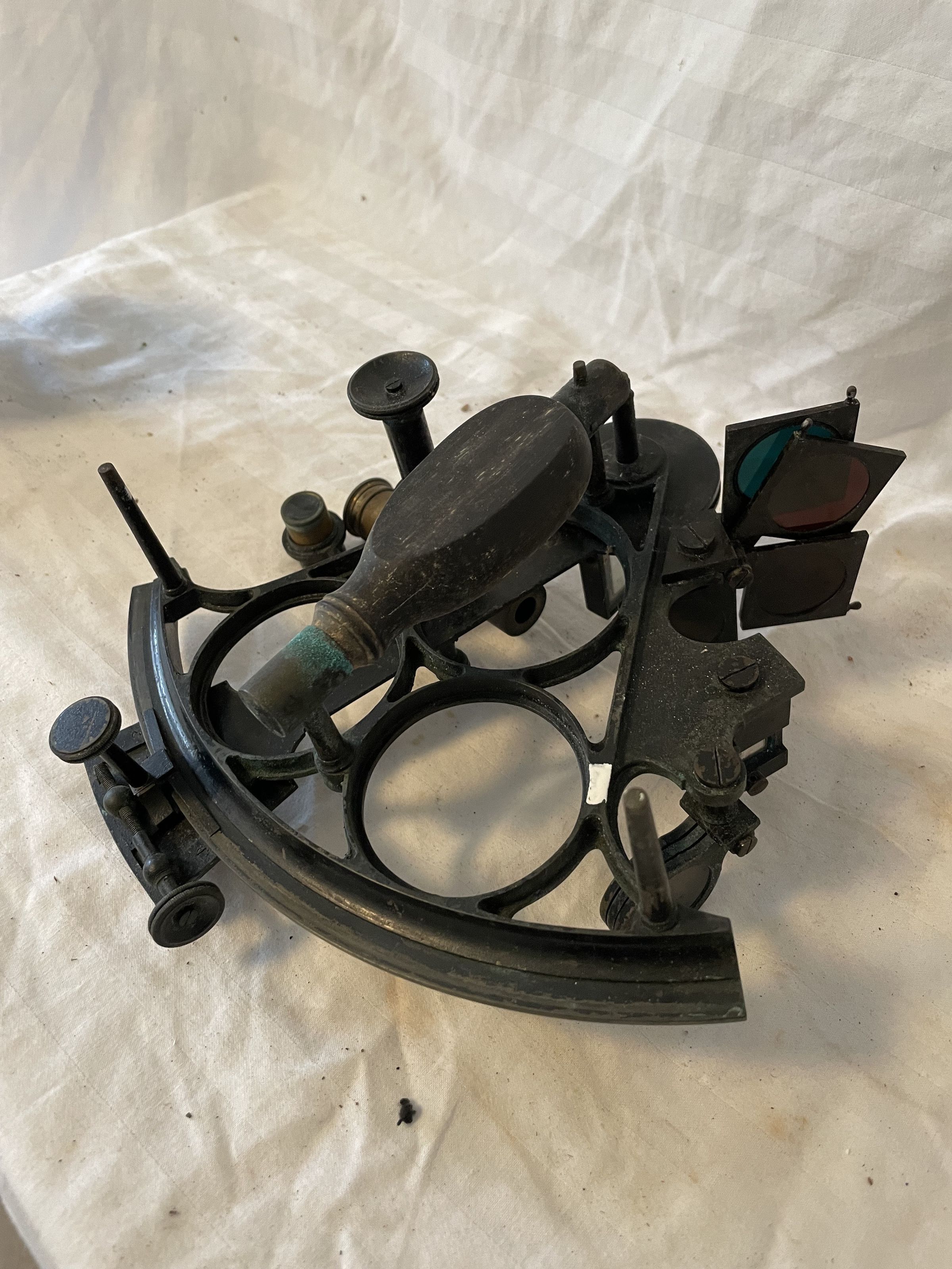 metal frame quadrant with colored lenses. Reads: Augent Wells Newport Manufactured by K. E. Costigan. Dealing in Nautical instruments