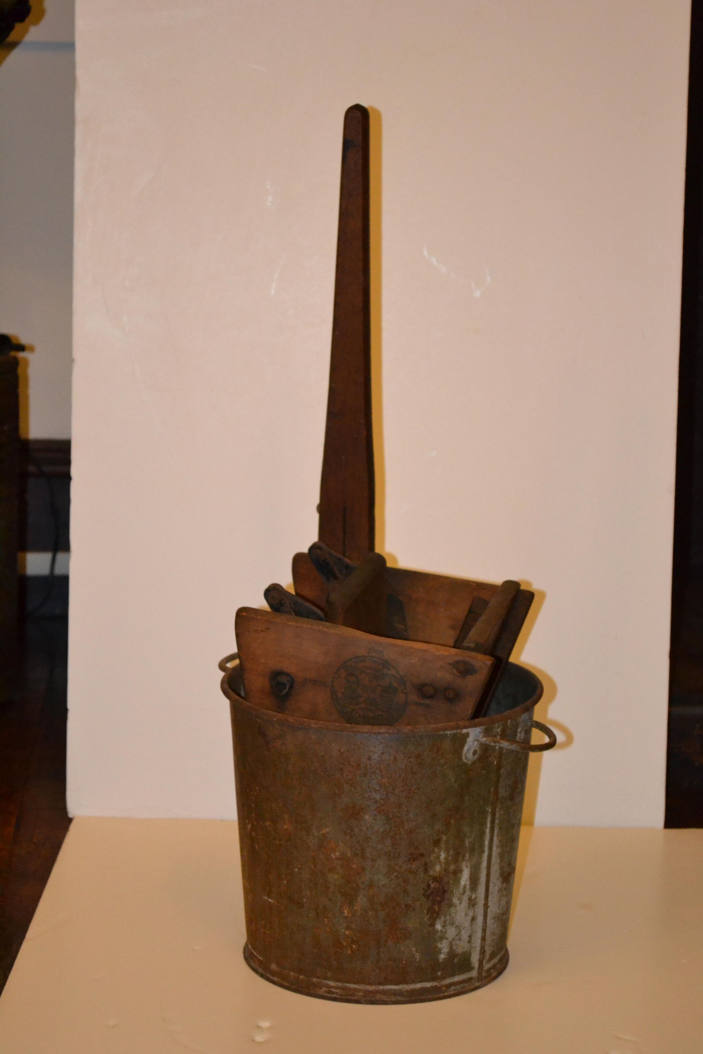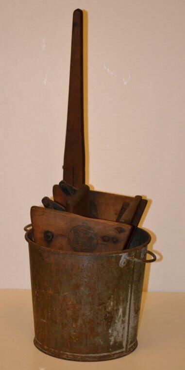 26 inches from base to handle tip x 9 inches. Made to fit into bucket so mop can be wrung out. Mostly wood with moveable parts made of black painted metal, mostly chipped. Advertising stamped in blue on many wooden parts. Original Inscription: MFG.D BY WHITE MOP CO. FULTONVILLE, N.Y. NO. 2 PUSH THE MOP IRON AND ALL FIRMLY DOWN INTO WRINGER.