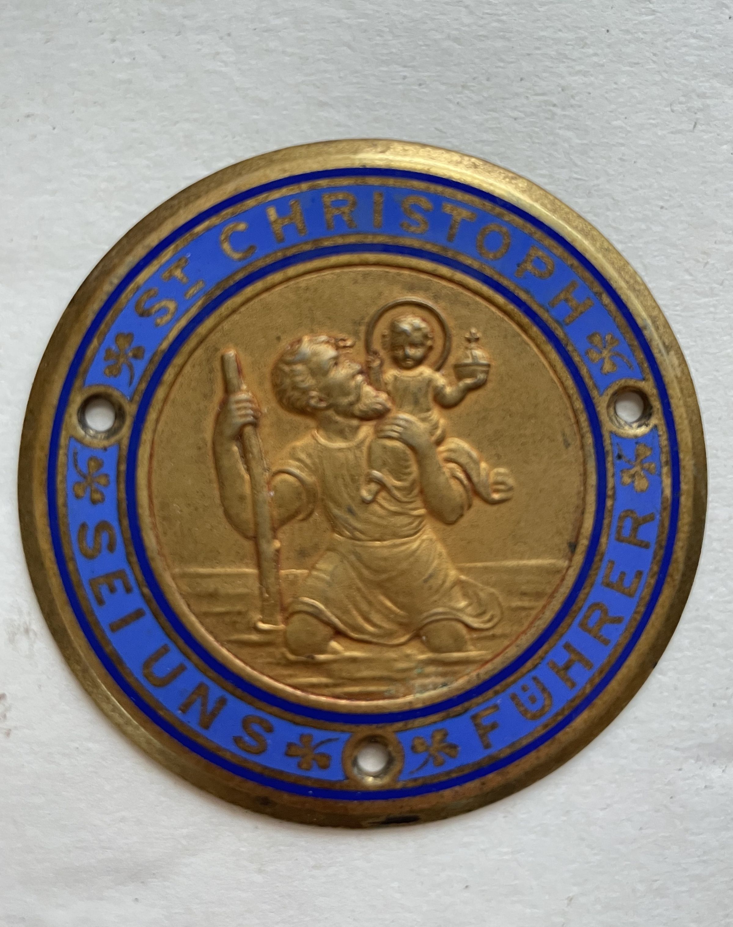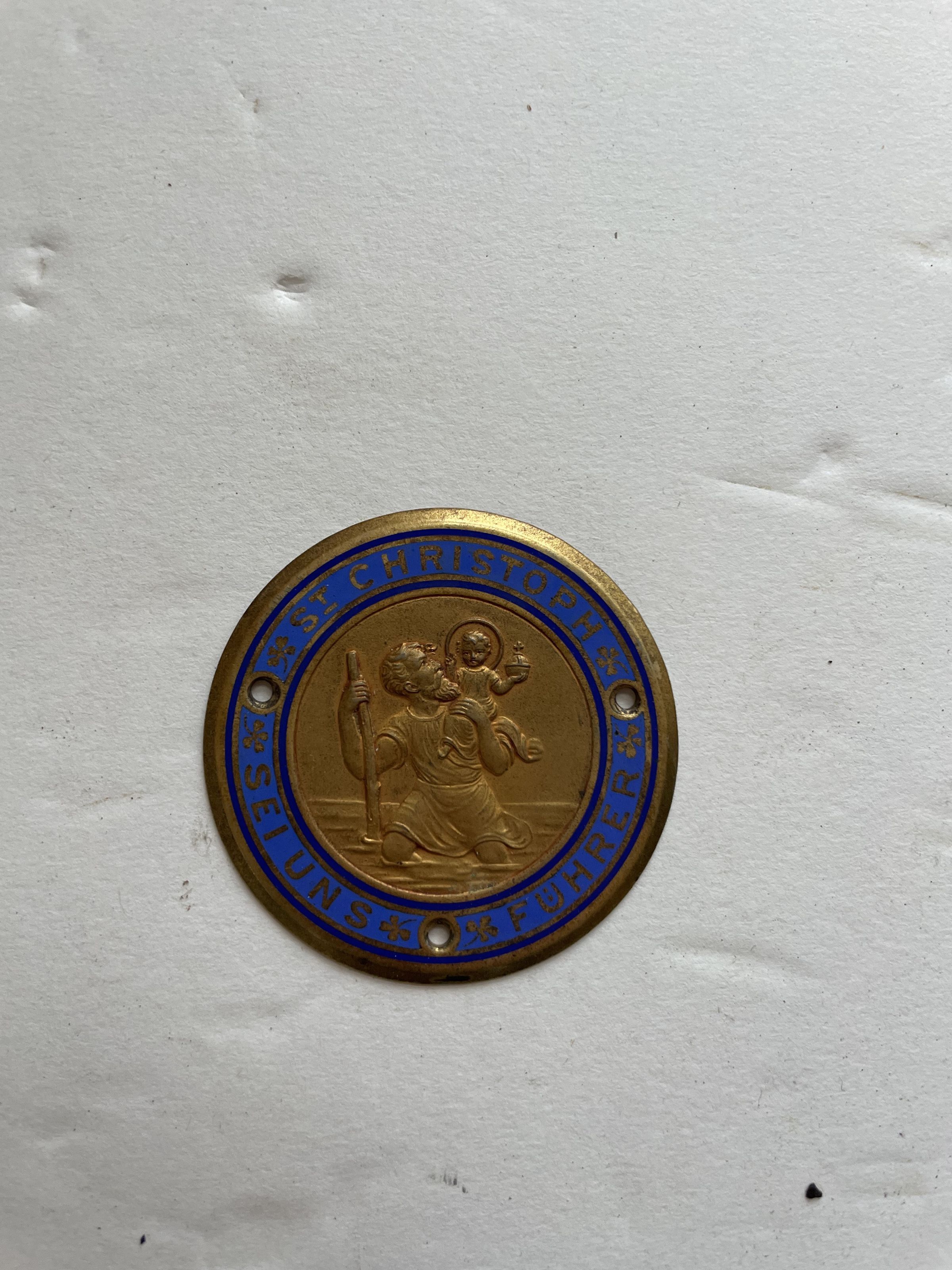 Small gold medal with an indigo blue ring. The medal reads "St. Christoph Seiuns Fuhrer"