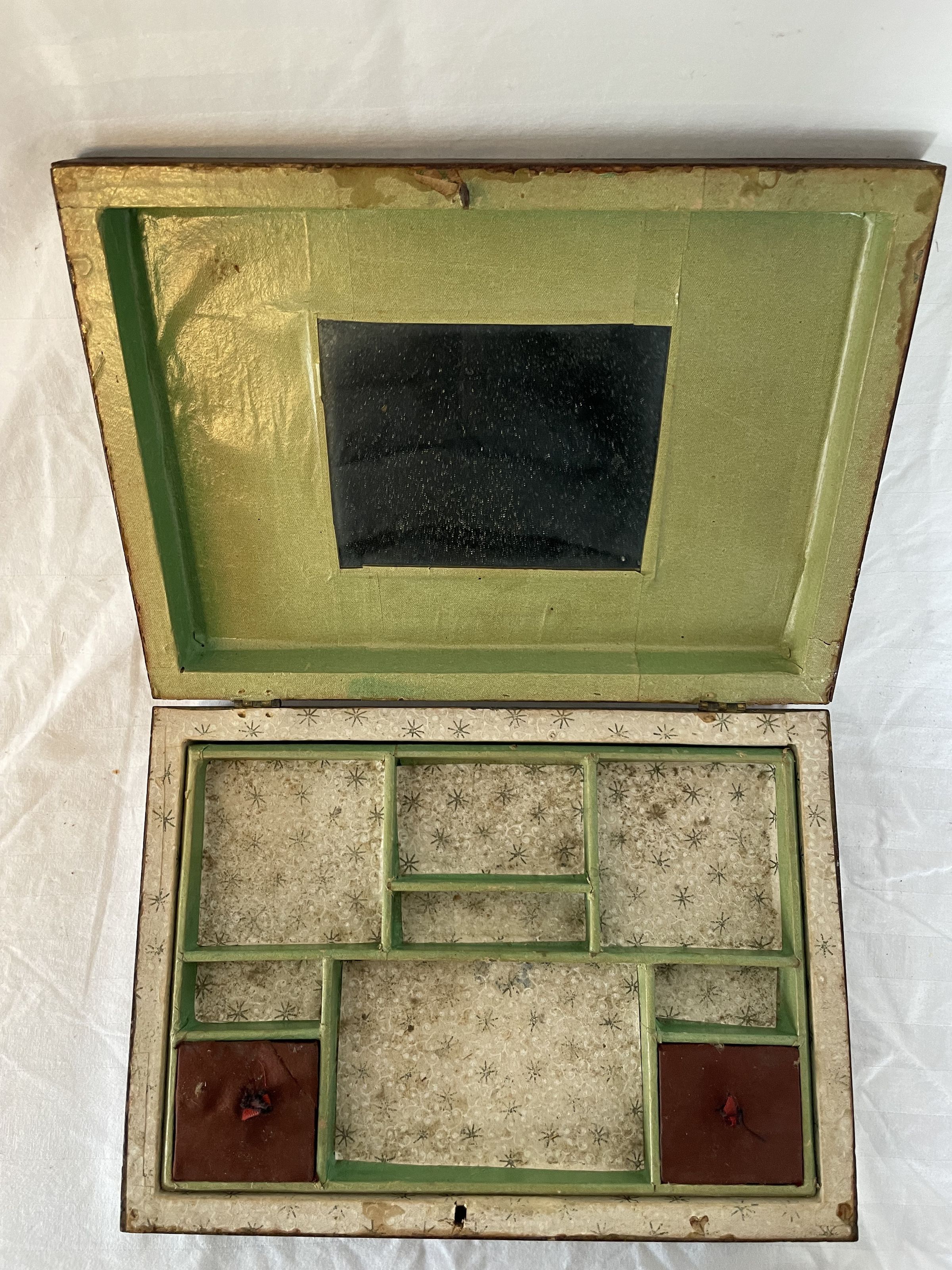 A medium sized jewelry box made from several different types of light wood. The top of the box is checkered with three different types of wood. The inside has green and off white starburst print. Green dividers and mirror