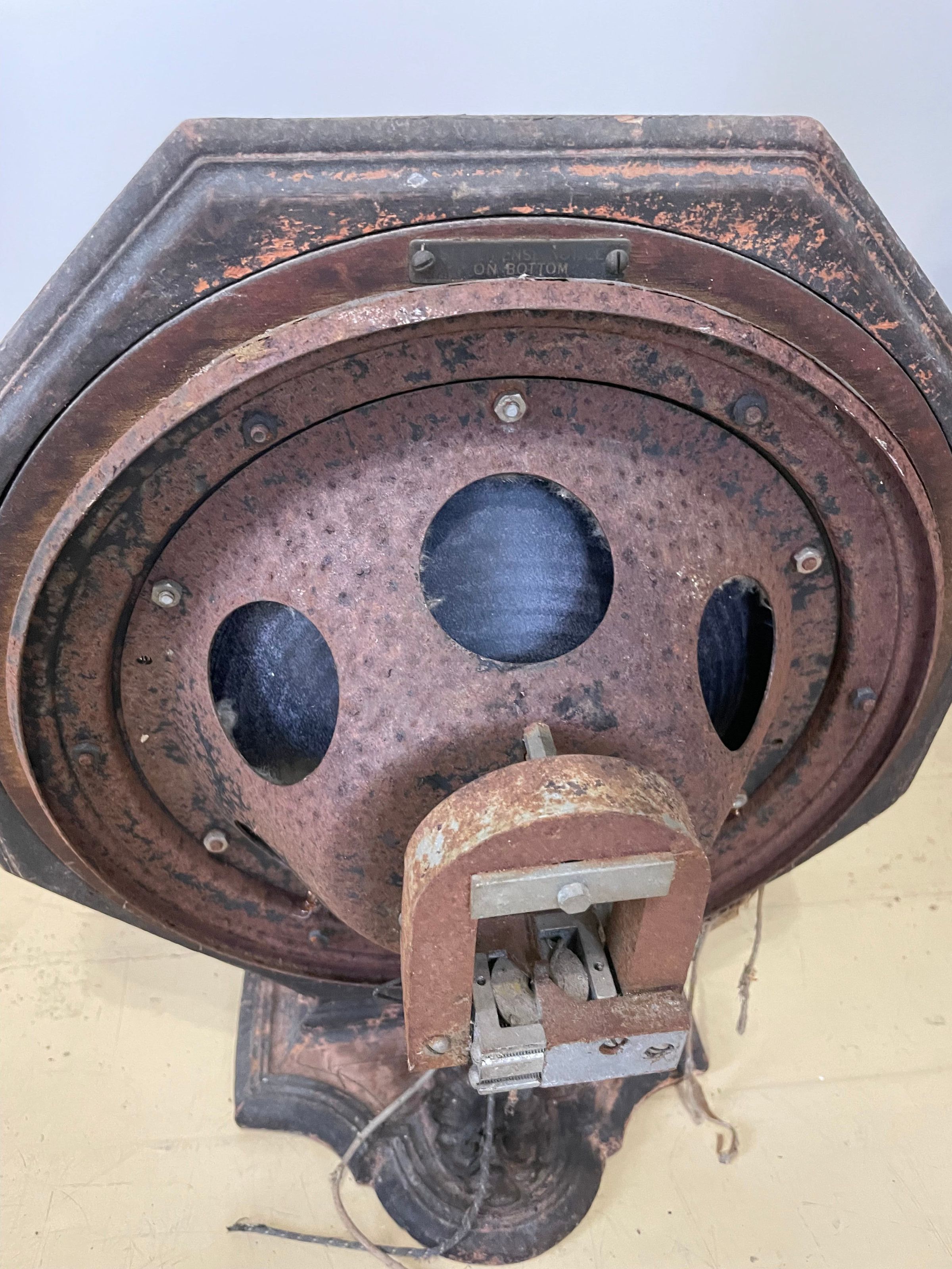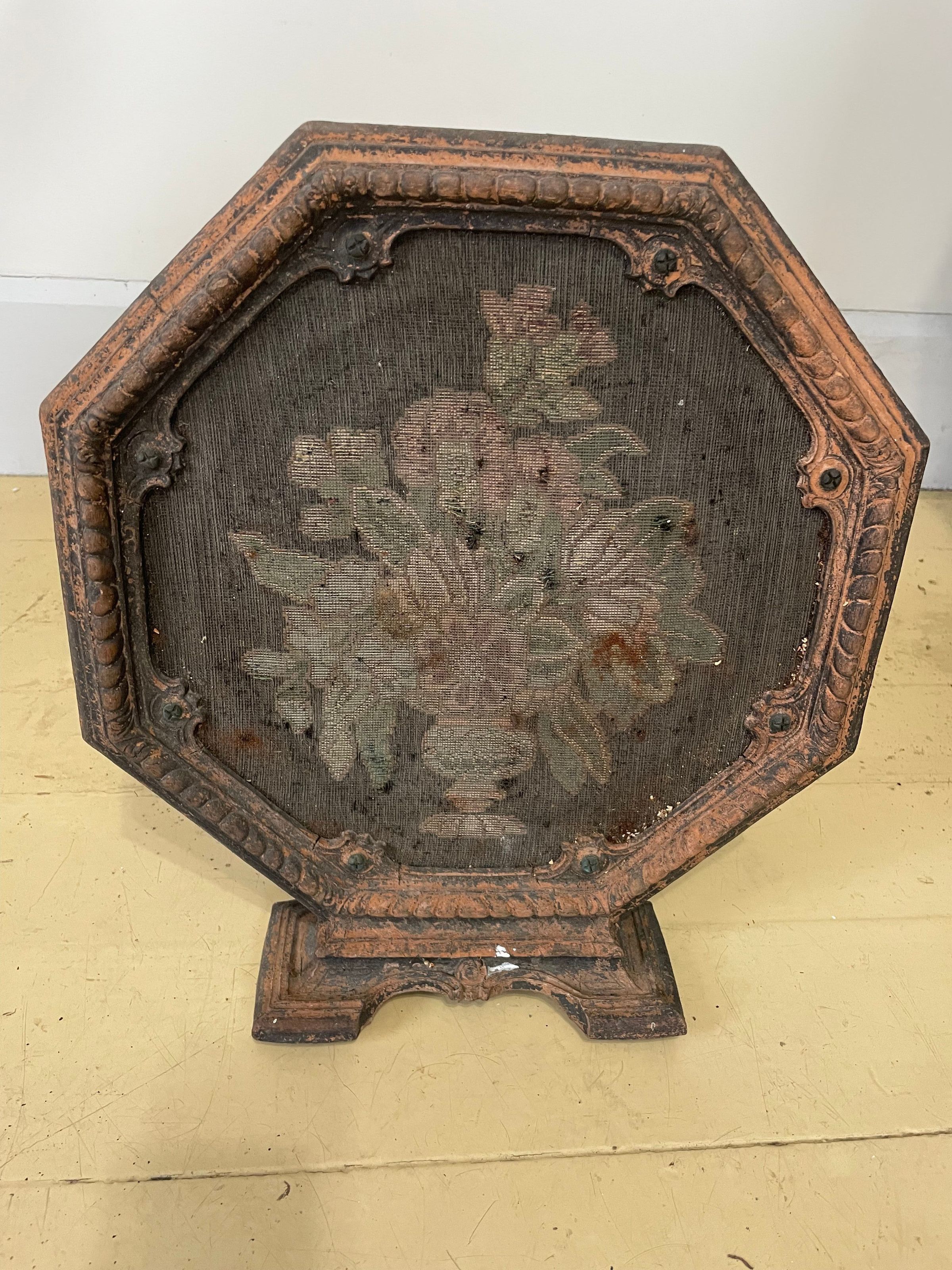 Needle point image of a vase with flowers on a metal and wooden framed sound device. Use is unknown. And orgine is unknown. Electric