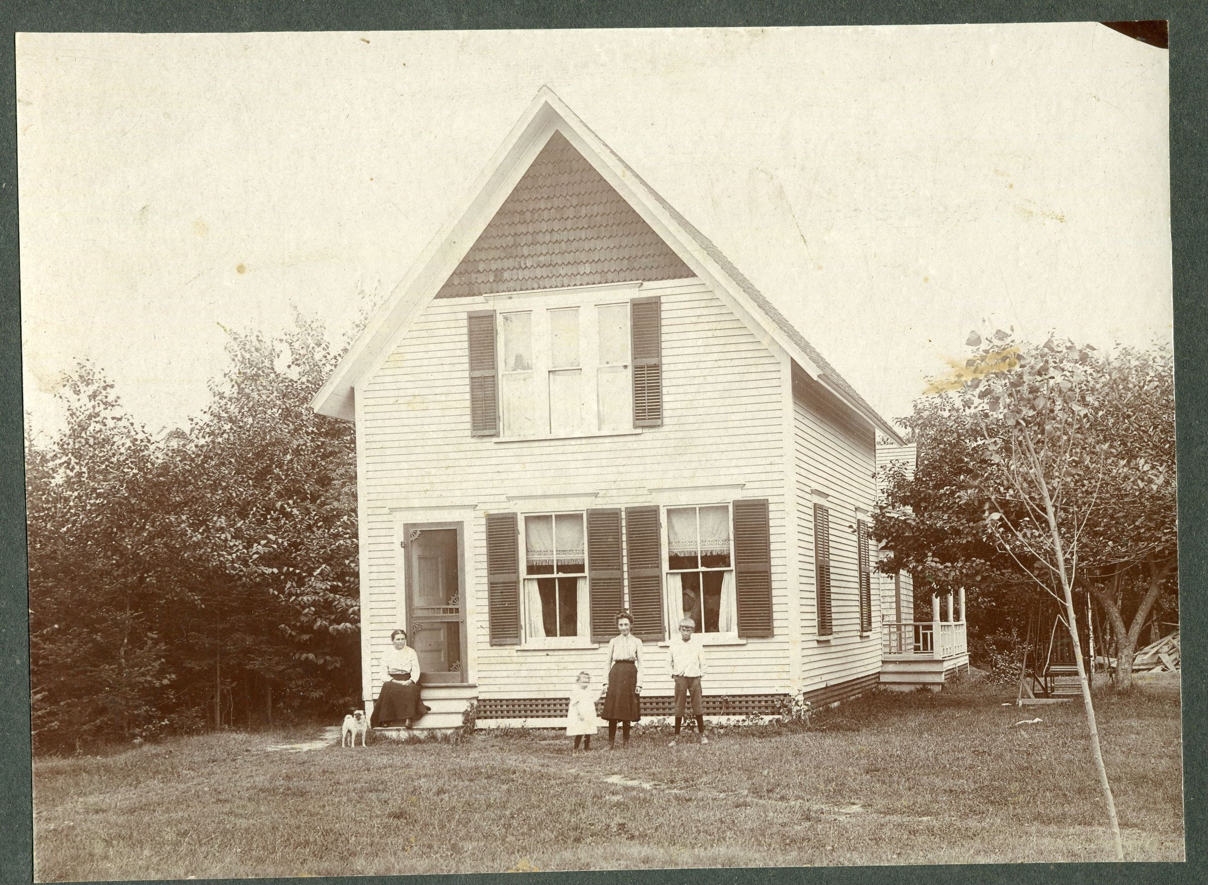May Pendleton (b. 1888, m. Eben Randlett) holding her brother Lloyd's hand. Either brother Howard or Charles at right. According to the note on photo, the house now belongs to Leonards. However, there is no date (c. 1900?). May was the daughter of Charles R. and Cora Higgins Pendleton.