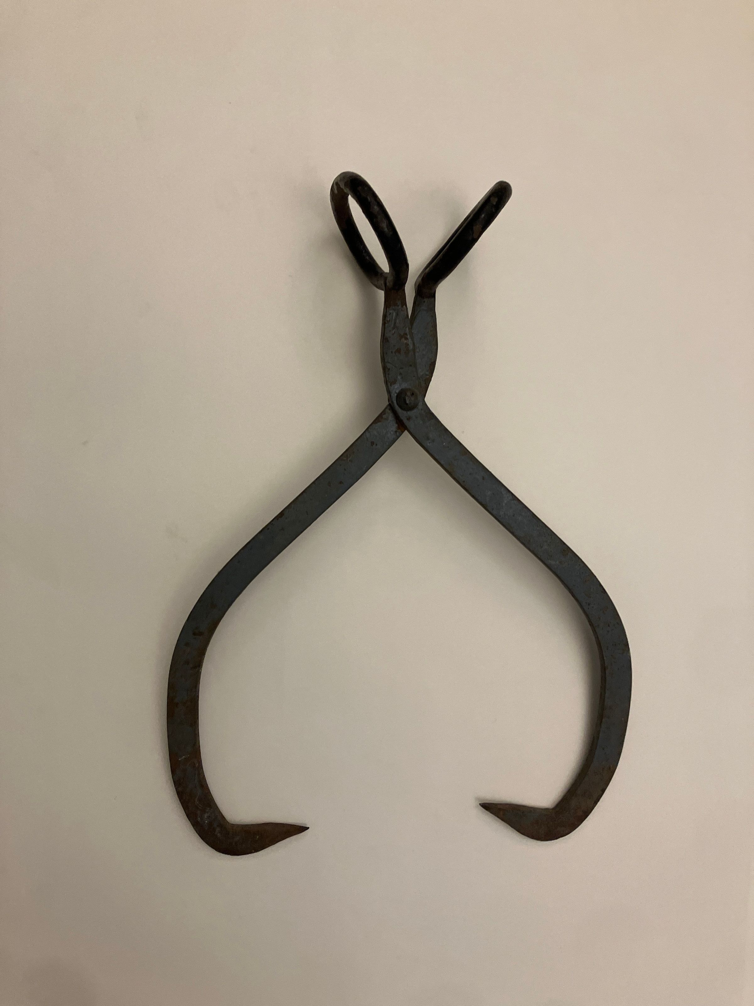 The ice tongs measure 17 inches x 10 1/2 inches when closed. Two pieces of iron each with oval handle and pronged end, held with bolt and washer at pivot point. Handles painted black, rest painted blue. Paint is chipped & rusty metal is showing through.
