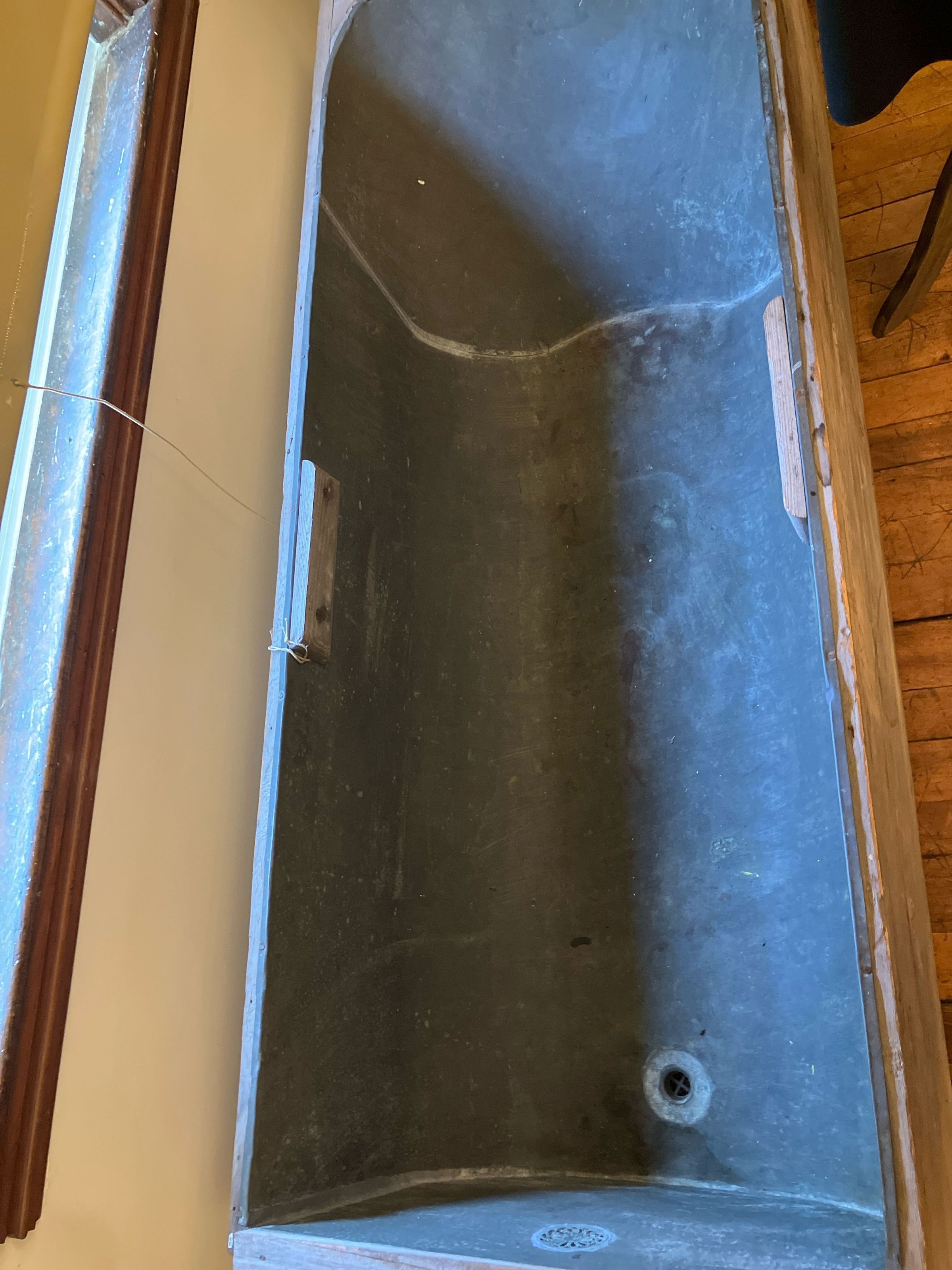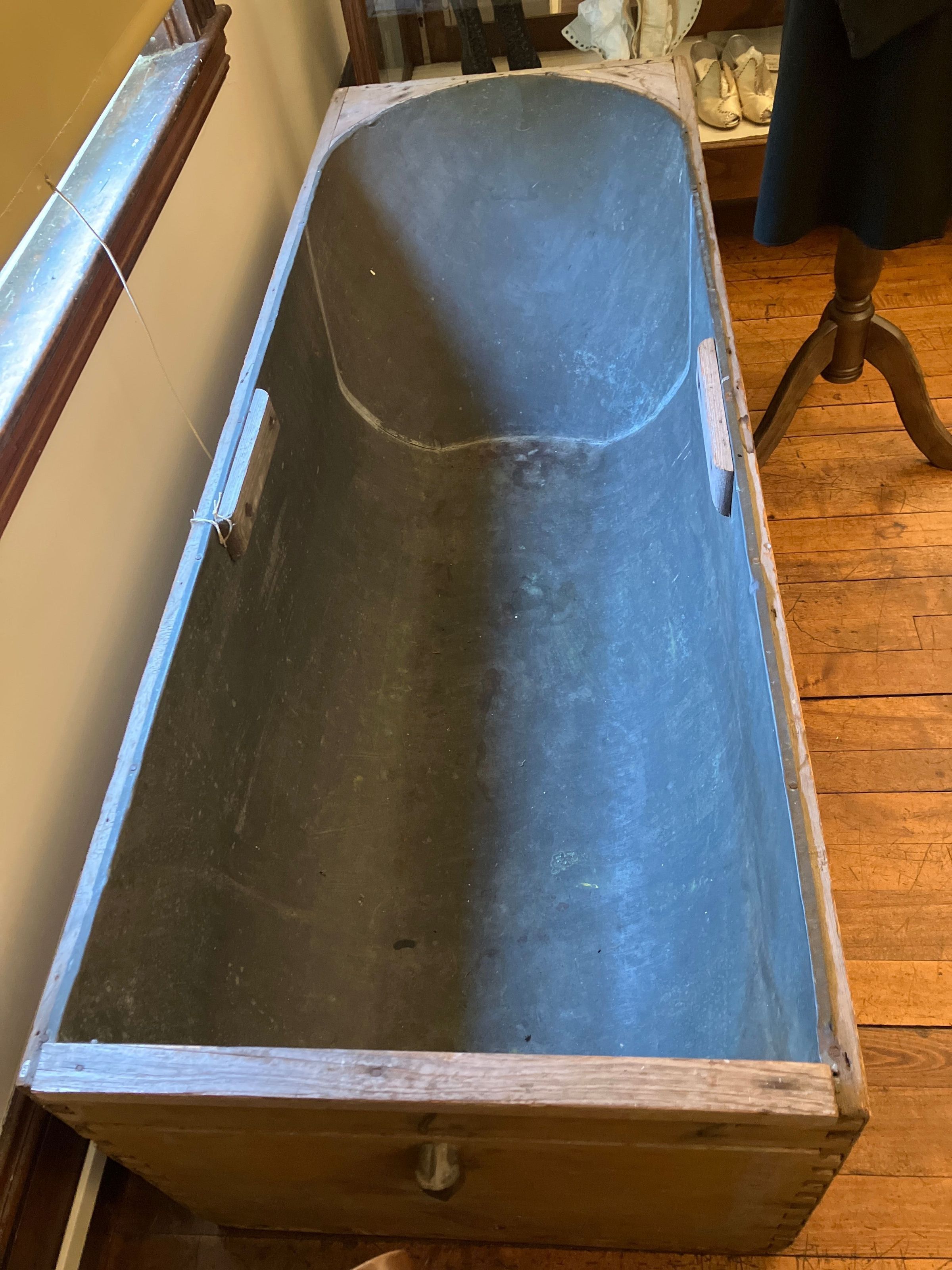 66 1/2 inches x 19 3/8 inches x 24 inches. Rectangular pine boards with dovetail construction form the outside of the tub. The tub is gently rounded at the head with wood forming the support. Tub is lined with metal which has one seam about 1/4 of the way from head. Wooden inserts 9 1/4 inches x 2 1/2 inches x 3/4 inch are screwed into each side of tub at the top edge. Has decorative overflow cut into the foot of tub and a drain.