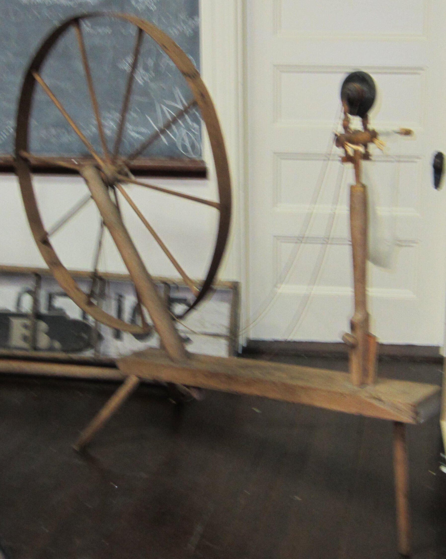 58 inches x 73 inches. Wheel: 43 3/8 inches diam. 10 spokes. Base: 48 inches x 5 1/2 inches x 2 1/4 inches, supported by three legs. Has accelerating head, missing spindle and original head. Tension device is wooden screw at base of upright shaft. Very plain.