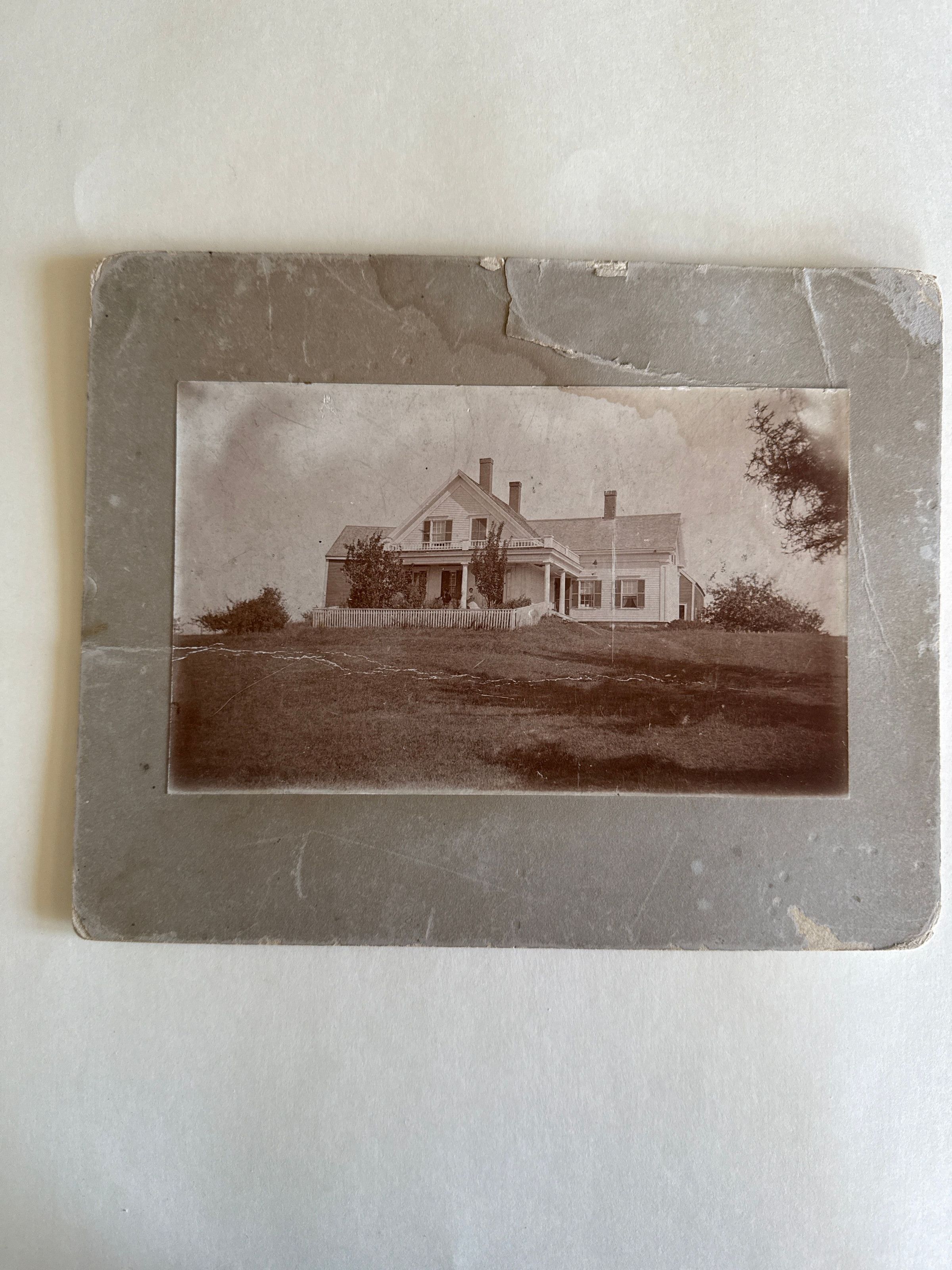 Inez Pendleton Home (married Mark Pierce Pendleton) House has an upstairs gallery and front porch with picket fence in front of it. Heavy trim in Greek Revival style. Three chimneys. Two people are on the porch. There is a barn in the rear. On back is written "GrandMother Pendleton's Home. Grand Mother and her maid Erdene Warren. Mrs Inez (Pendleton) married Mark Pierce Pendleton."