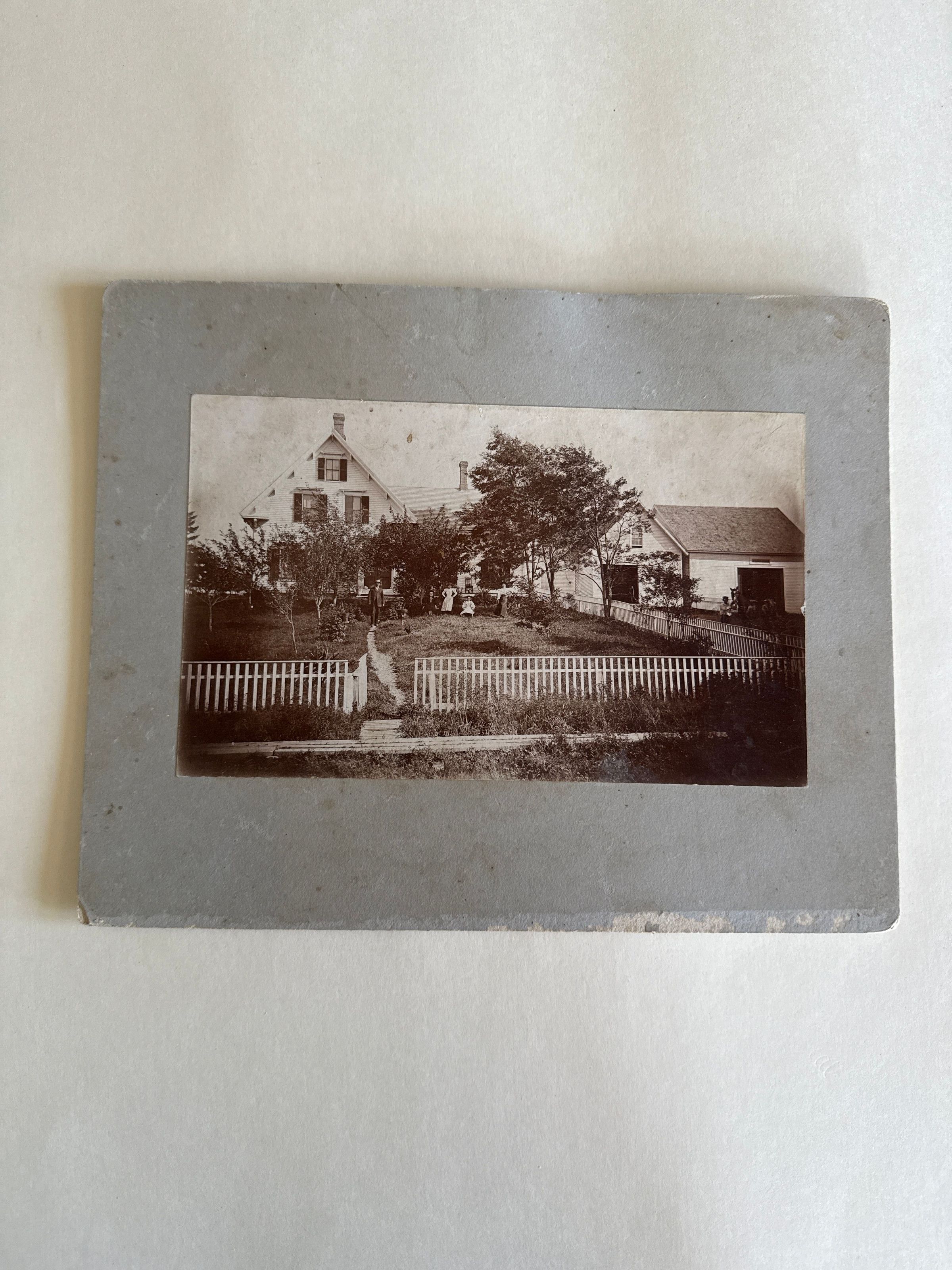 Captain Guilford D. Pendleton House, about 1890. The house has two barns. Someone is standing with a horse near the barn. On back is written "Our house about 1890. Dad, Mother, Kate, Anna Louise and Hattie, the maid.