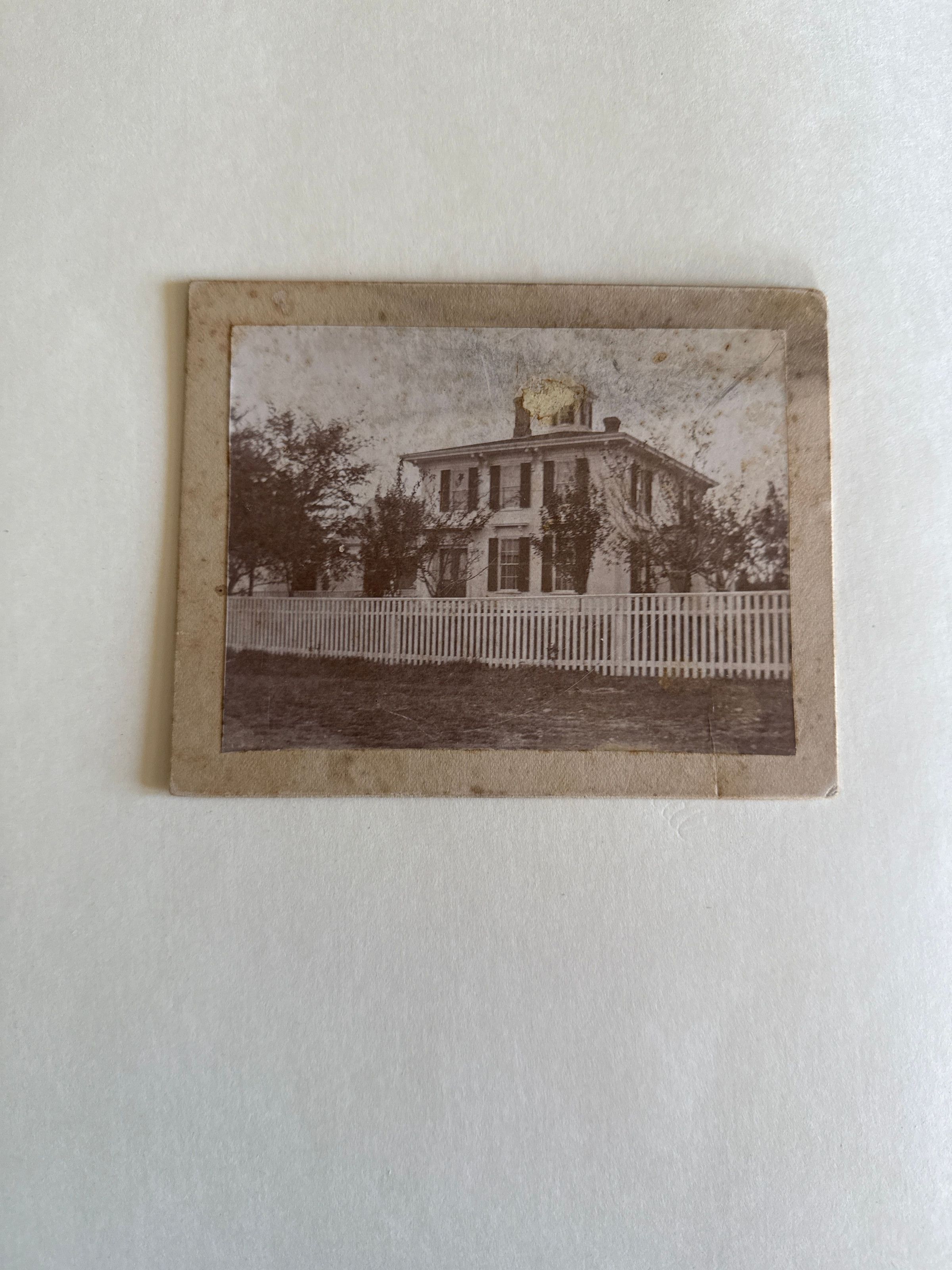 Unidentified , two-storey four-square home, white with black shutters, cupola on center top, two chimneys, Italianate trim, double doors with glass panels in recessed front entrance. A picket fence fronts the house
