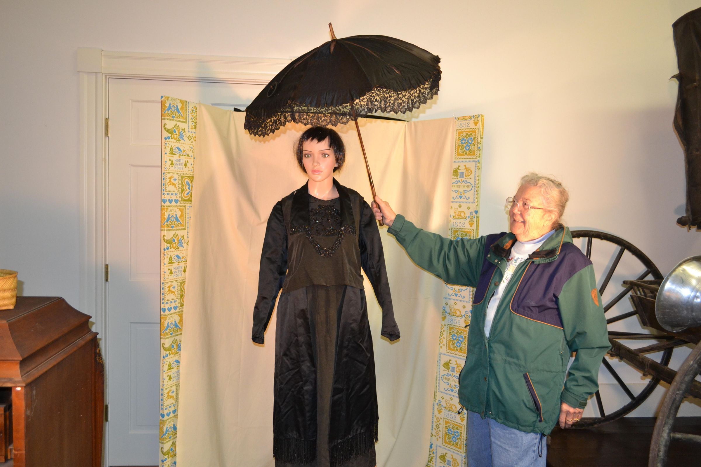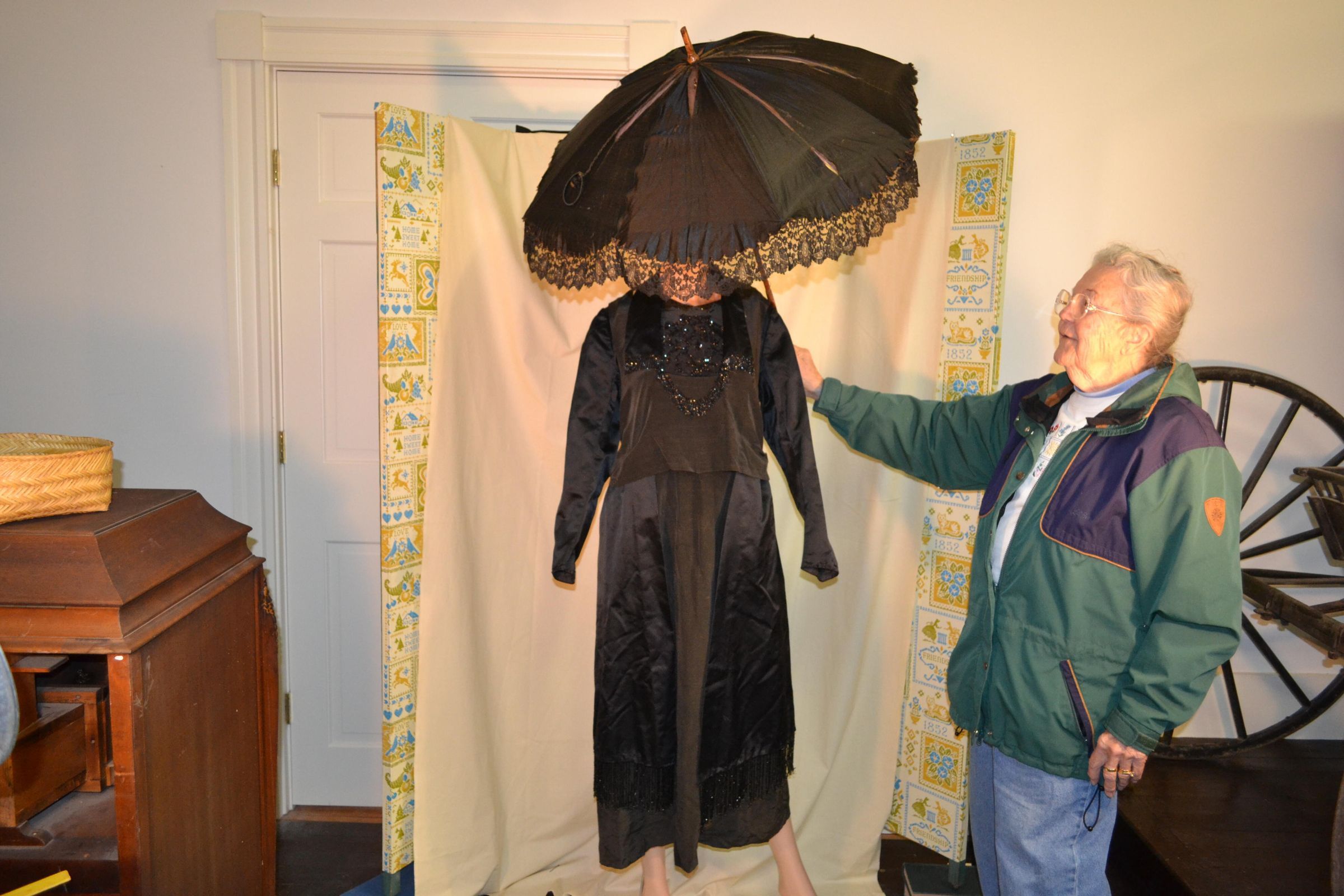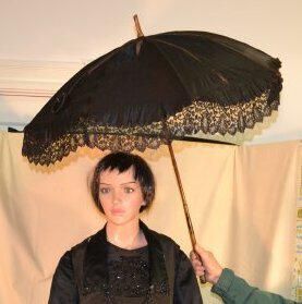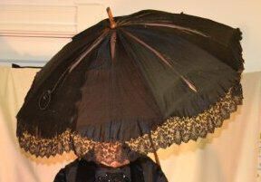 Closed - 33 1/4 inches long. Black parasol with scalloped edges trimmed with black lace. Handle and tip are made of wood. Interior support system is metal. Parasol is held closed by black fabric ring. Ring is attached to wooden tip by cord. Interior is lined with lilac fabric.