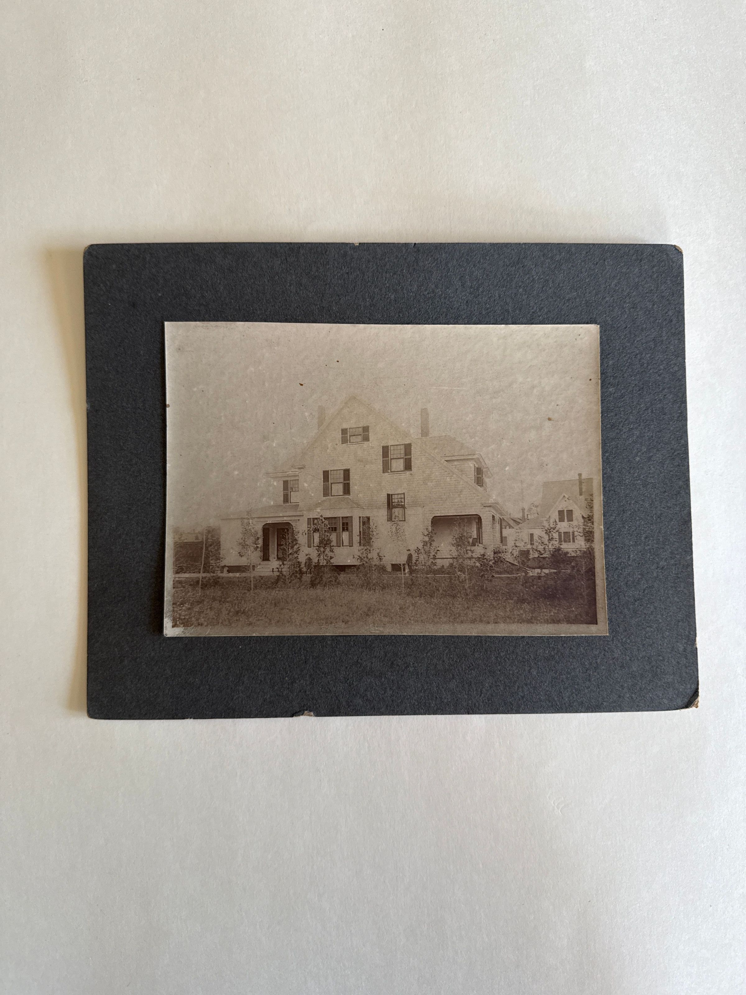 5" x 7" photo, mounted on black cardboard, showing a 3-storey house with 2 covered porches, two chimneys. On back is written "David Smith office, now Nevin's house, built by Capt. Charles Pendleton." House has two 2nd floor gables, and a first floor bay. The shutters are dark. Another, large home stands nearby. Both substantial houses; perhaps Dark Harbor?