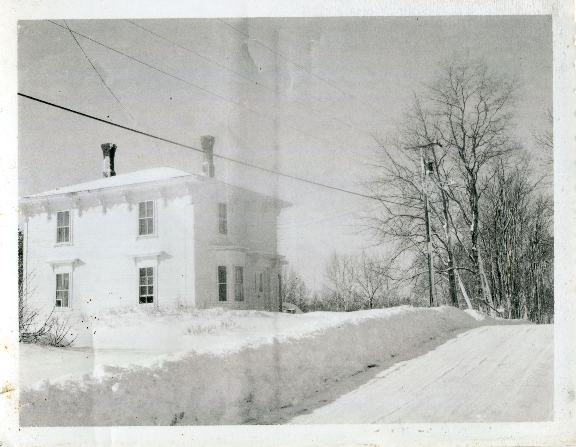 Four-square white house, two-storey, two chimneys, Italianate trim, on a hill, in the snow. On back identified as Everett Williams / David Boulton.