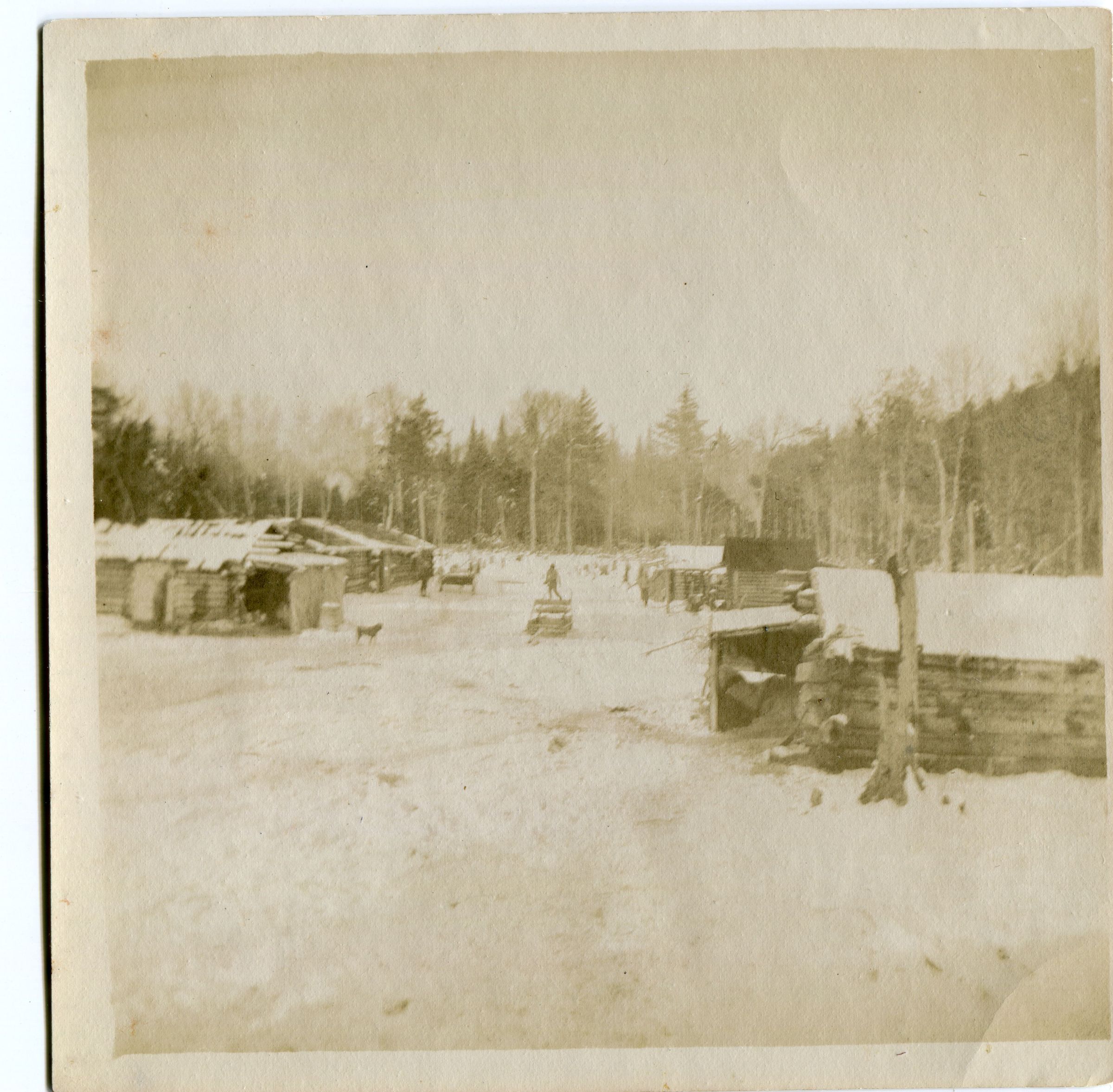 Snapshot 3.5" square showing an open field with sheds and stacks of lumber, a sled, a dog. On back is noted "Mitchel's"