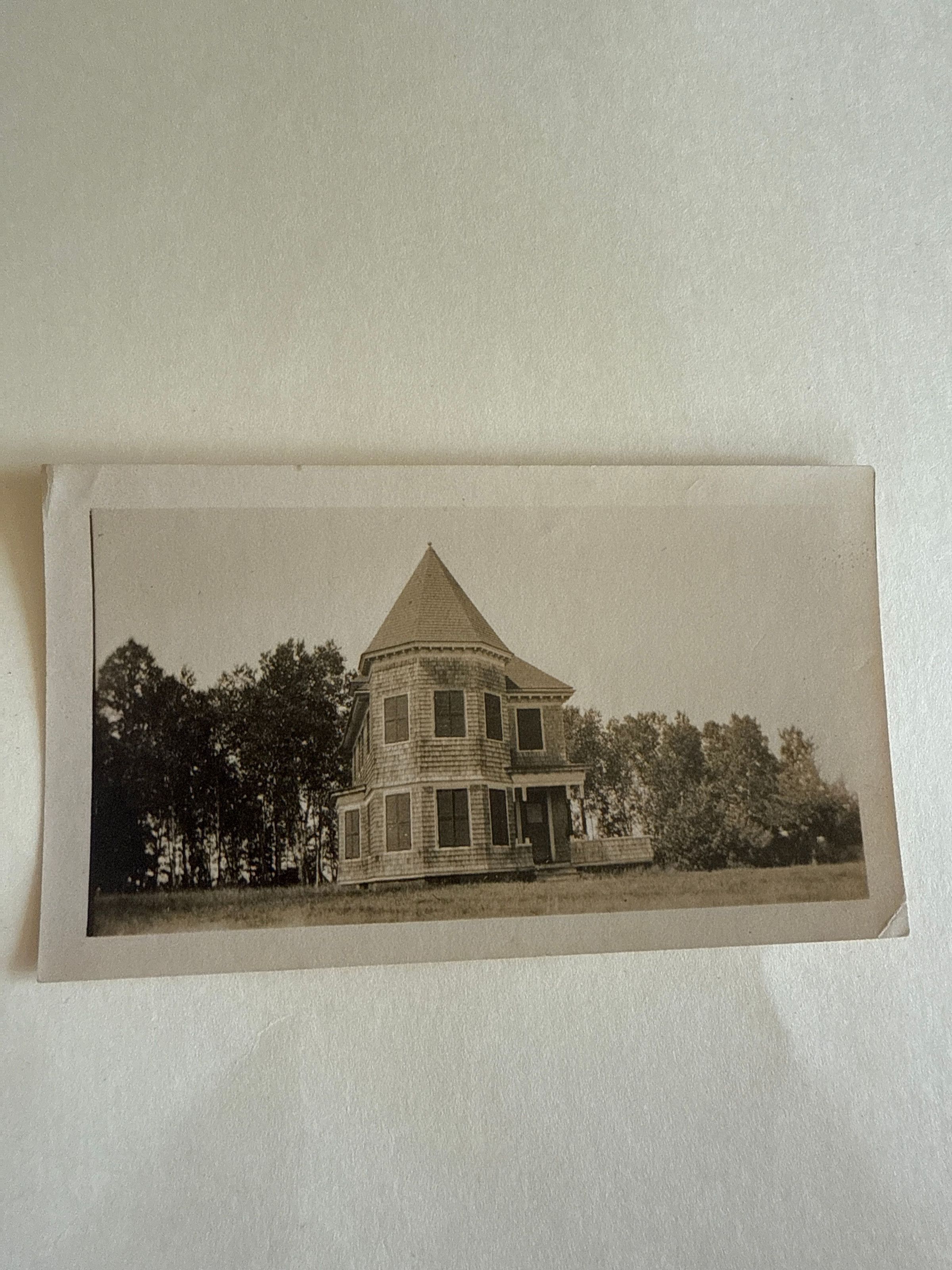 Snapshot of a shingled house with 2-storey turret, late Victorian. Not identified.