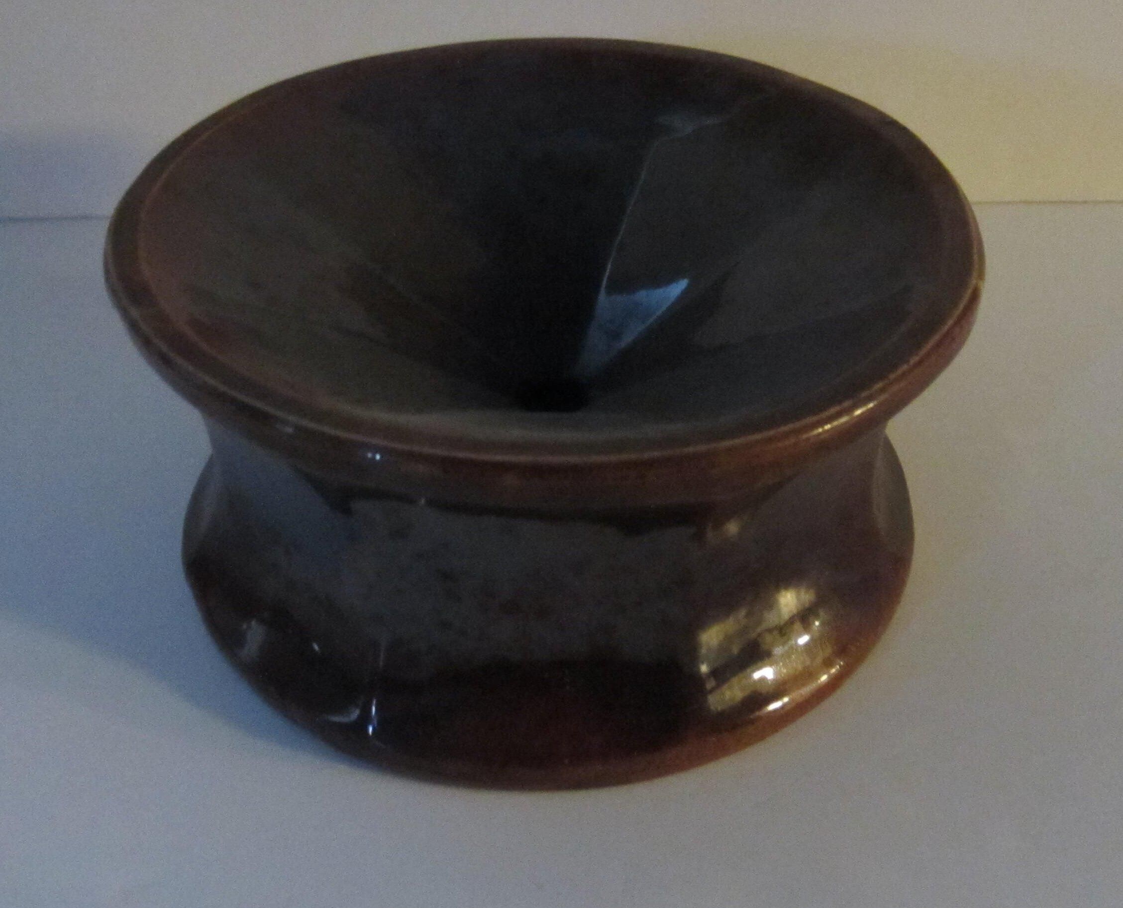 8 inches x 8 inches x 3 1/4 inches. Brown glazed ceramic, top covering slopes into hold 3/8 inch in diameter. Sides and top are octagonal. A triangular opening 1 5/8 inches x 7/8 inch shares two octagonal sides.