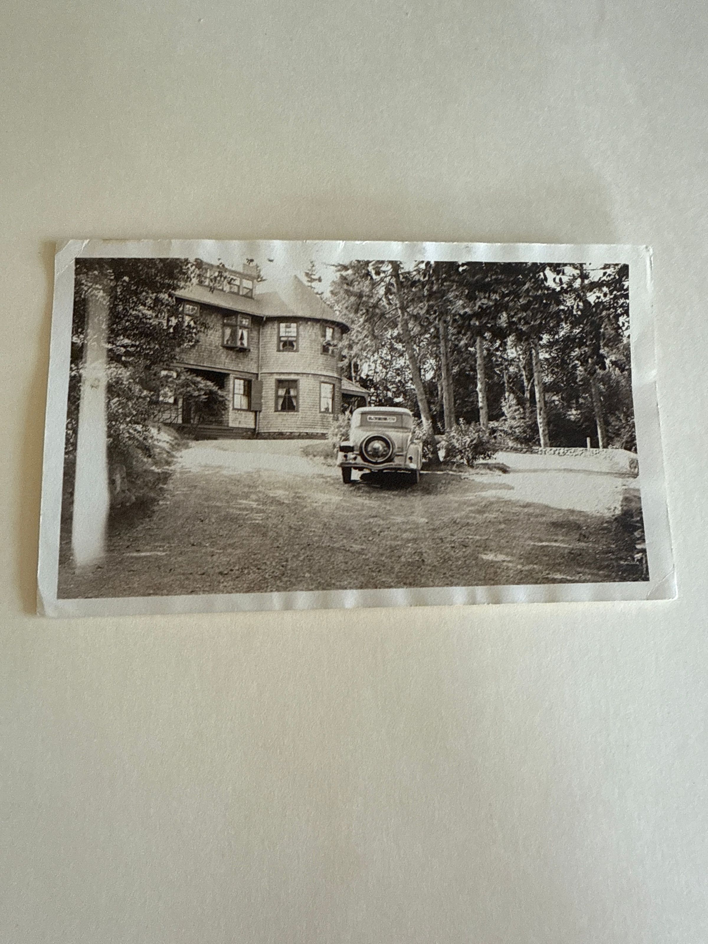Snapshot 3.5 x 5.5 showing Alexander Biddle Cottage (3-storey, shingled, turret) with a 1928(?) roadster/rumble seat, in driveway