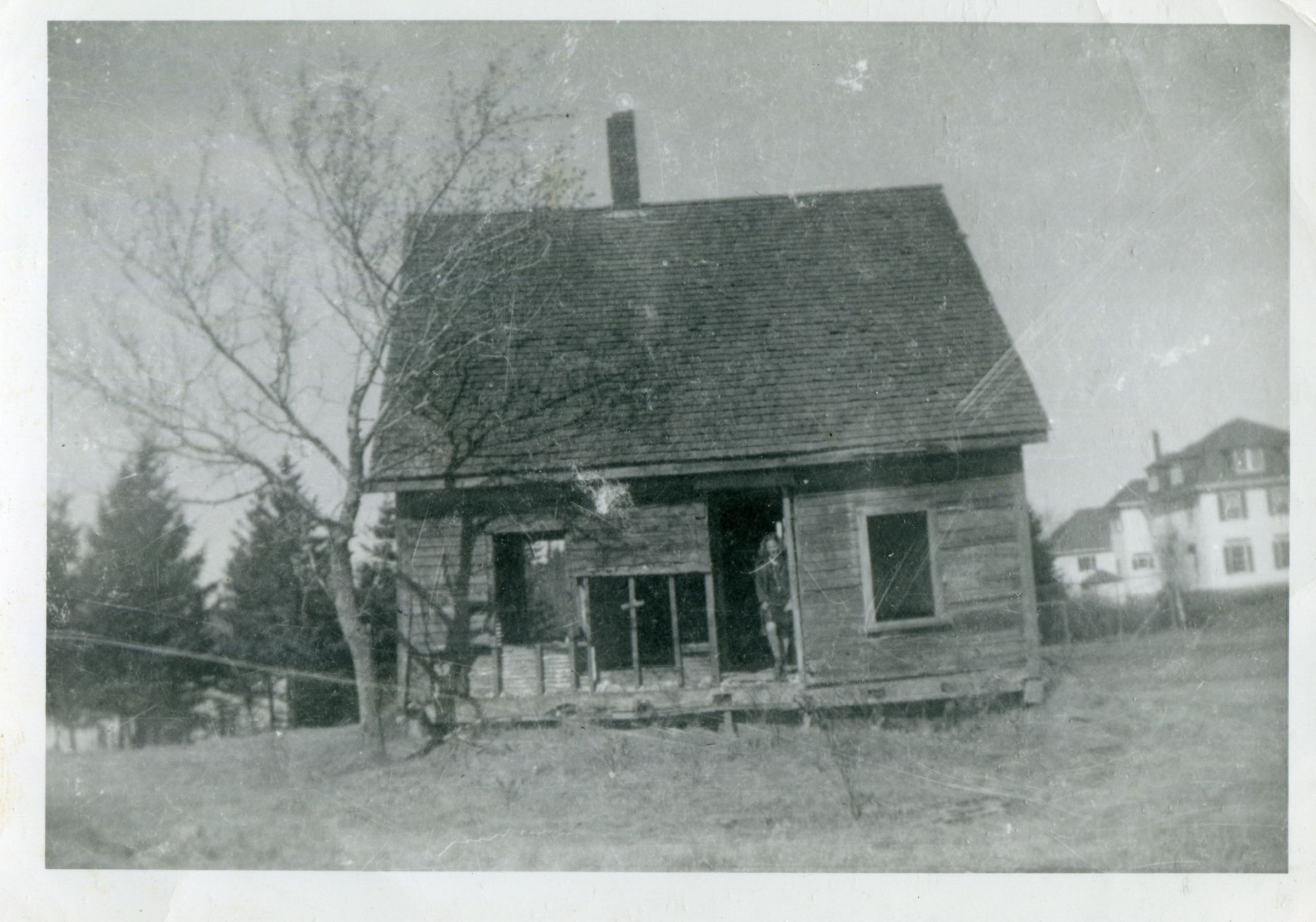 Snapshot picture of a very dilapidated house. On back identified as Bill Dick's house. Large four-square house in background