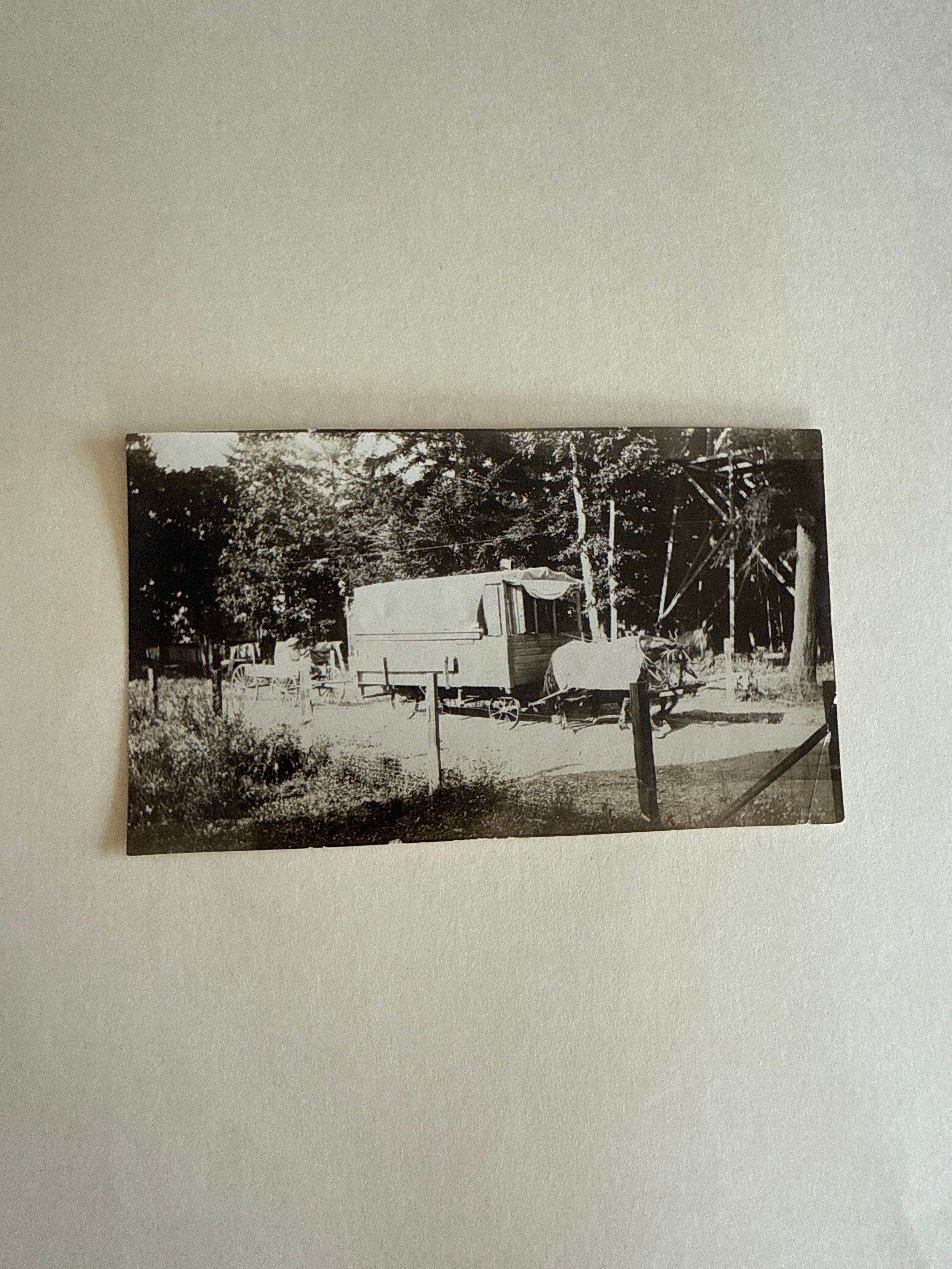 Small snapshot of a house trailer on a wagon pulled by a team of horses with another 4-wheeled buckboard pulled behind. On back "1st mobil home."