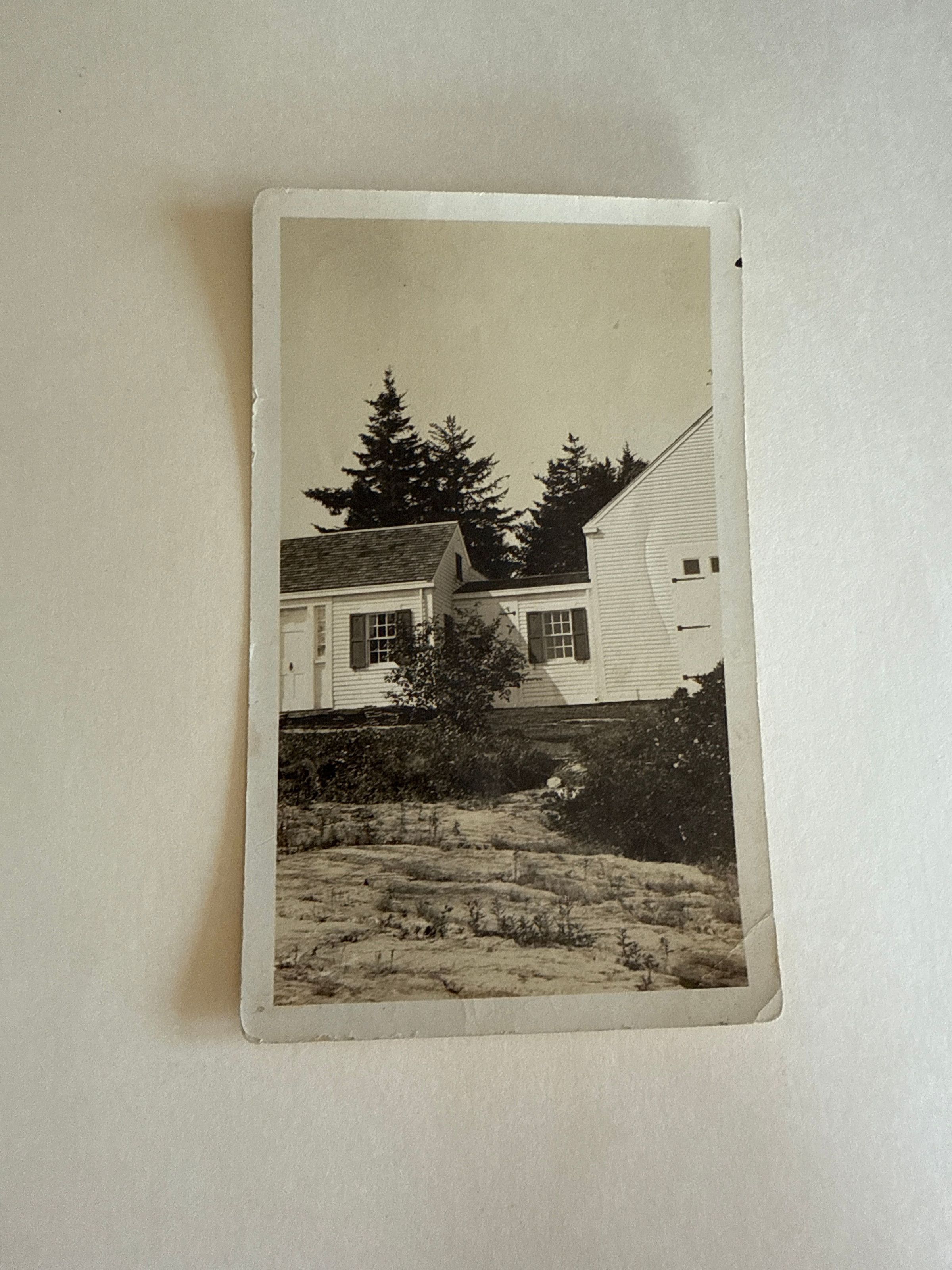 Snapshot of portions of a house, clapboard, with ell and barn. On back "Beach Cottage at Pendleton Cove-Greyledge. R F Rothschild 1975, Built 1930 by Maitland Alexander" (notation by Maureen Rothschild?). And also "Dads - Building time - only he knows"