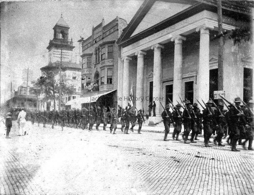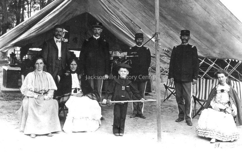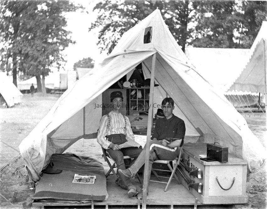 That Dandy Little War pages 92-101 including Camp Cuba Libre soldiers John Hiayan and George B. Jordan of Company K, 50th Iowa Regiment; East Springfield camp, 1898; Young soldiers in their tent; Camp guests; Colonel Willian Jennings Bryan, 3rd Nebraska Volunteers 1898; Troops drilling on Pablo Beach; 9th Illinois Volunteers camp at Panama Park in Springfield; Soldiers drill along Ionia Street; Troops march on parade past the National Bank Building at Forsyth and Laura Streets; Flag-draped young women at patriotic rally in Riverside ParkCollection