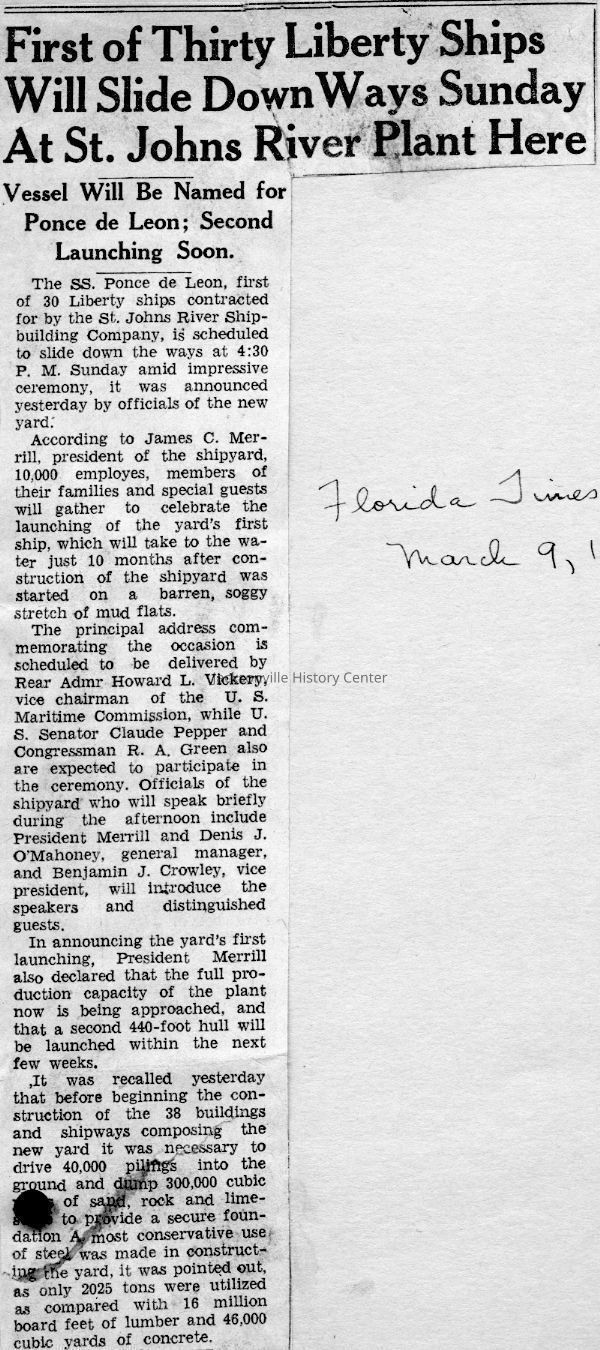 St. Johns River Shipbuilding Co., Ships, Shipyards, S. S. Ponce de Leon, Liberty (Ship)Scope and Content