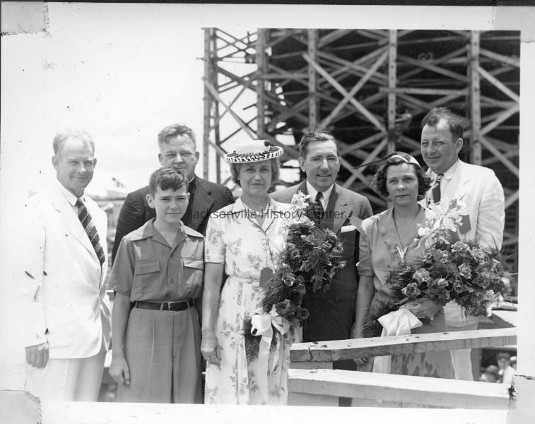 Launching party of the S.S. John Philip Sousa, Hull #8 July 4, 1943. Left to right: Kenneth A. Merrill (Master of Ceremonies), Kenneth A. Merrill, Jr., Msgr. D.A. Lyons (St. Paul's Catholic Church), Mrs. D.M. Barnett (Matron of Honor), Senator Claude Pepper, Mrs. Kenneth A. Merrill (Sponsor), Mr. William S. Johnson ("Jax" Chamber of Commerce).Collection