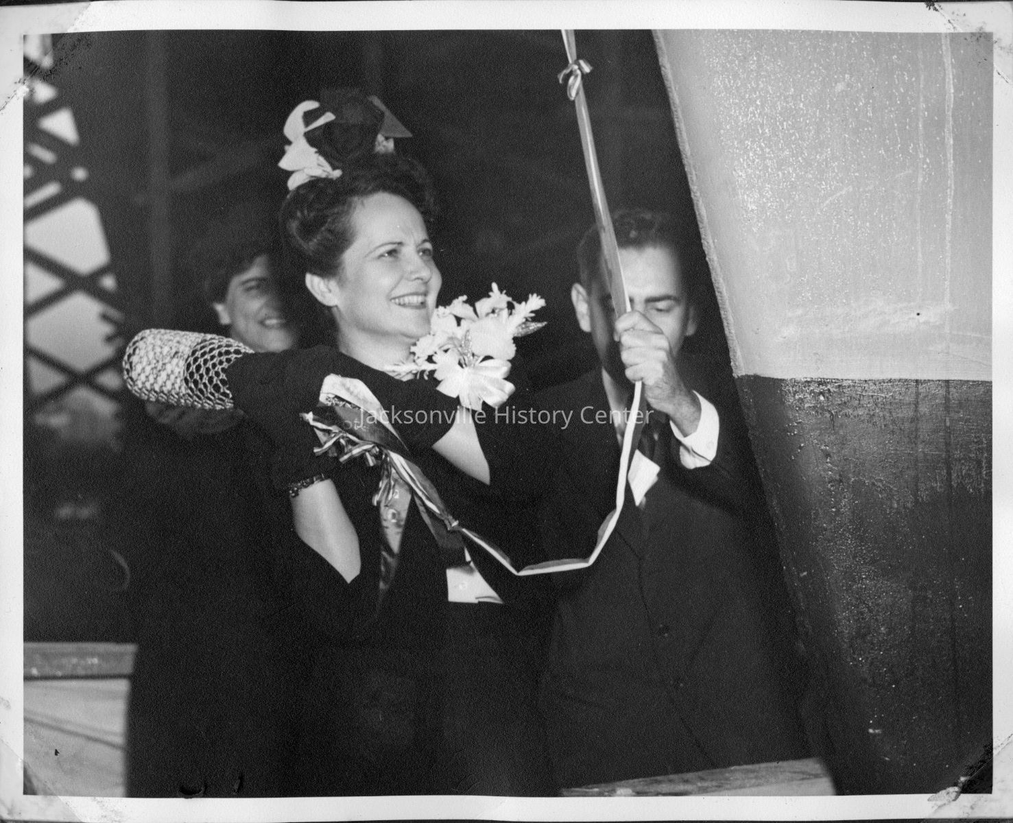 Mrs. Claude Pepper (Sponsor) and Mrs. Louise McGregor (Matron of Honor) and Kenneth Small at the christening and launching of the S.S. Thomas Sully at the St. Johns River Shipbuilding Co. in Jacksonville, FL on September 4, 1943.Collection