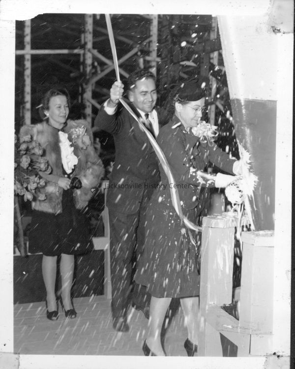 Unknown woman, Kenneth Small and Mrs. Cora E. Owens christening the S.S. John White Hull #26 launch at the St. Johns River Ship BUilding Co., in Jacksonville, FL.Collection