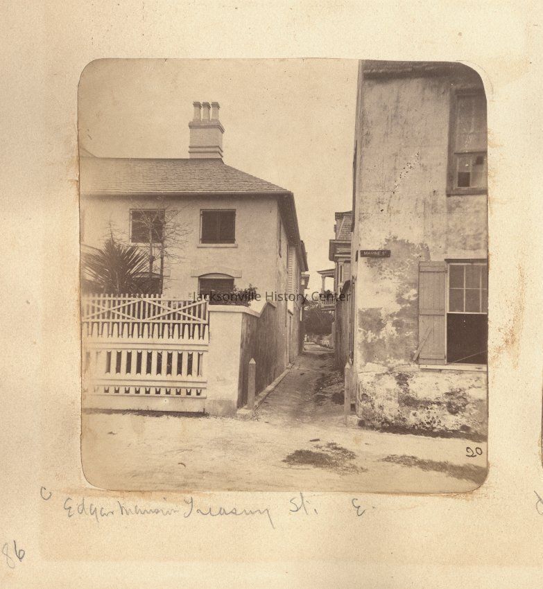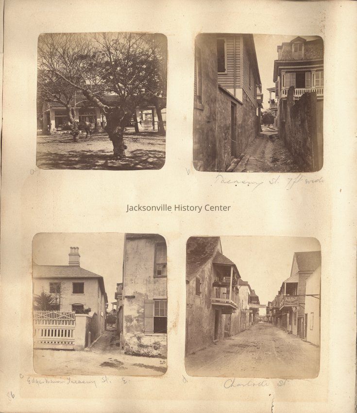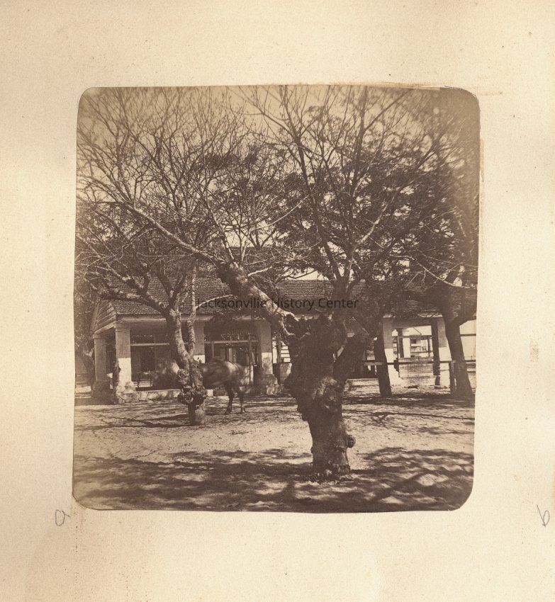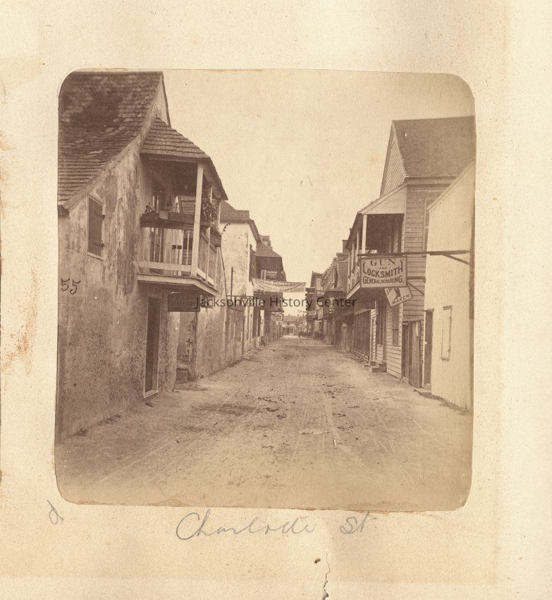 Cigar Store Wholesale, Animals, Plant, Treasury Street and Marine Street, Gun and Locksmith General Repairing, Street, Market, Charlotte Street, Building, J. D. Rake, Maker, Tree, Florida Views, Edgar Mansion? Treasury Street, horse, St. Augustine, Florida, Treasury Street, 7 Feet Wide, Road, Livery Stable, Fence, 7 Foot Wide, TailorScope and Content