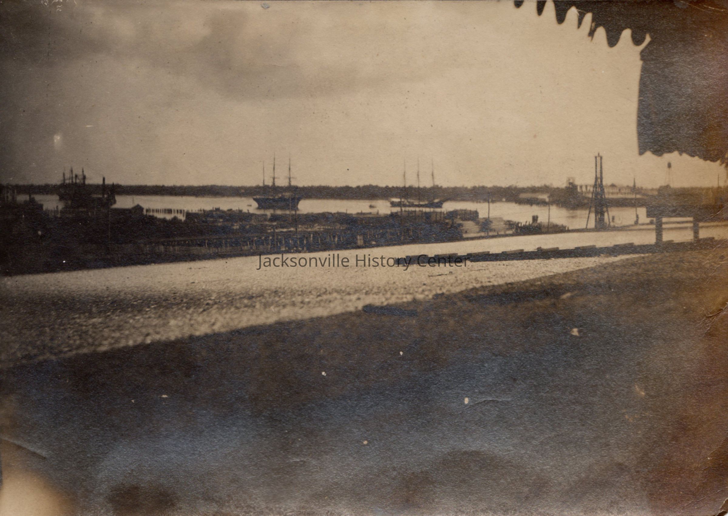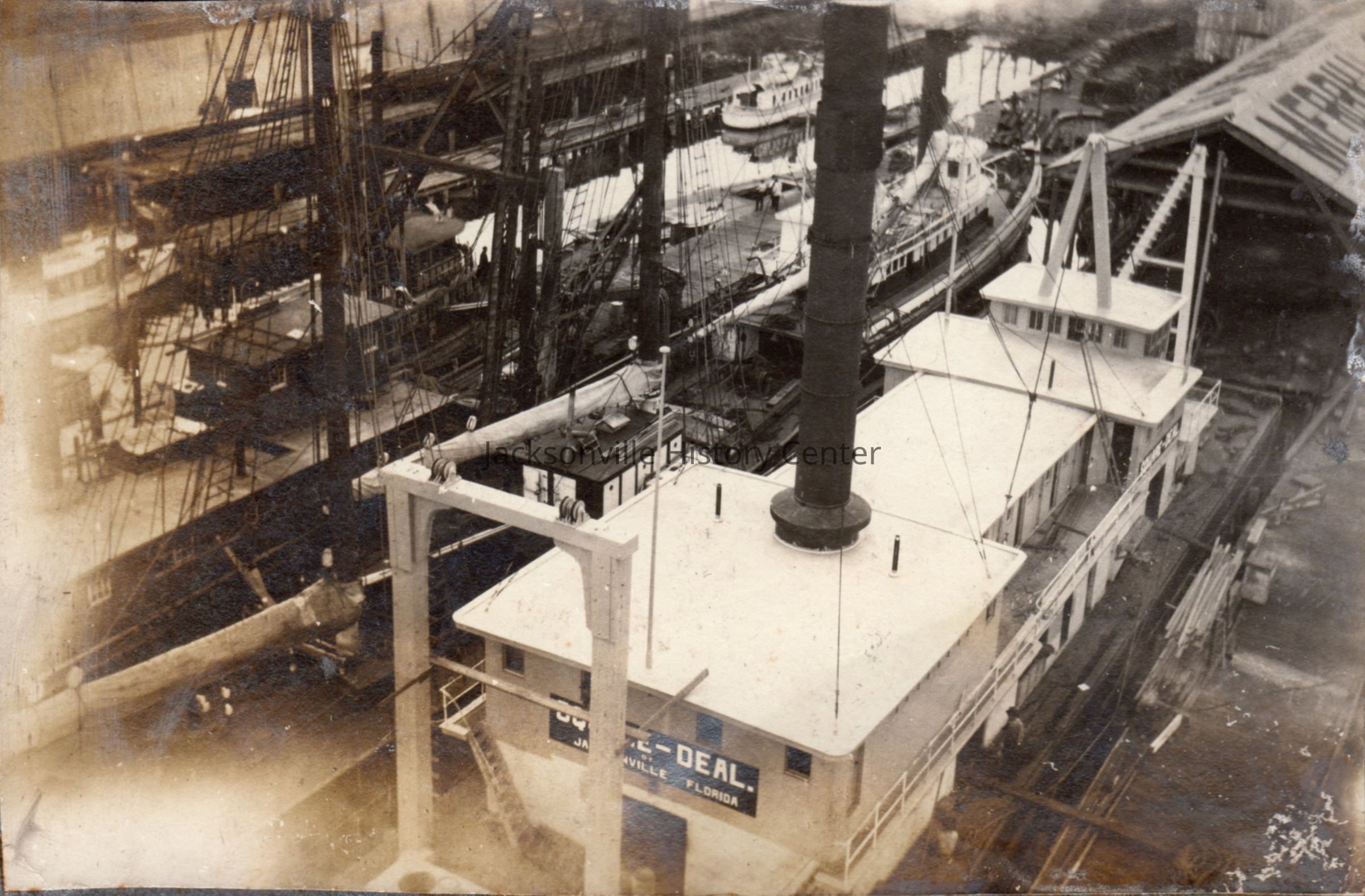 Four (4) images of the Merrill-Stevens Engineering Company in Jacksonville, Floirda. Two photos are of the front and back of a ship in a dry dock. One photo is of the "Square-Deal of Jacksonville" in the foreground and other unknown ships docked. One photo is of the St. Johns River with four (4) schooners on the river. These photos are mounted on paper from a scrap book or photo album page.Collection