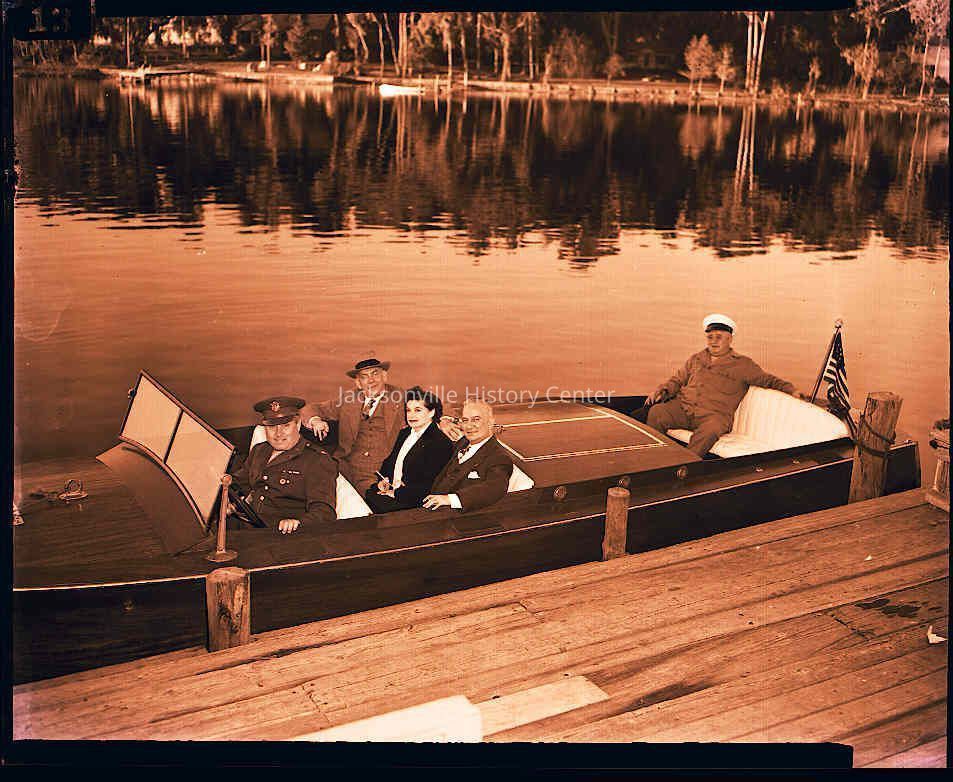 Jacksonville Retail Liquor Dealers' event at camp or lake. 3 men and 1 woman in motor boat.Collection