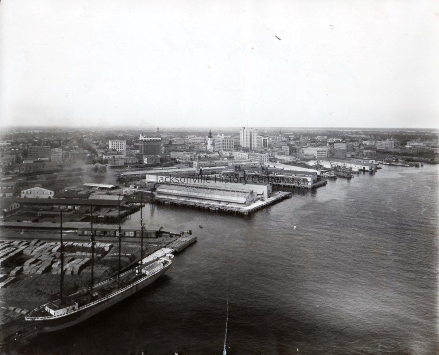 Aerial view of Jacksonville waterfront, docks and the St. Johns River