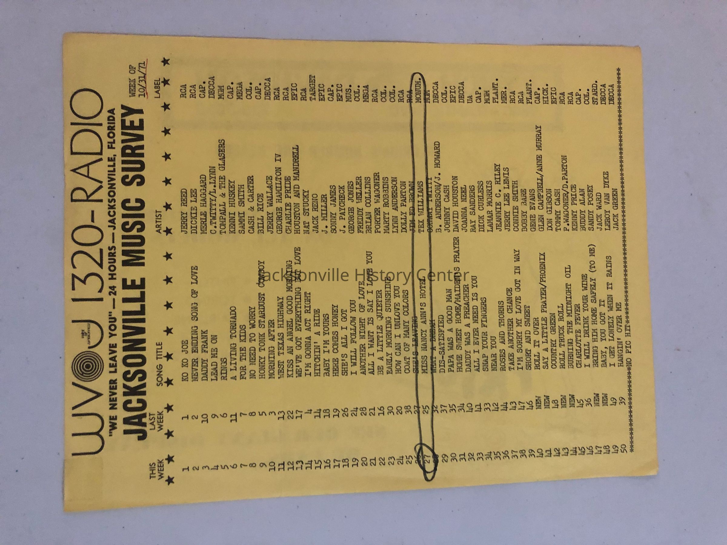 Song list: "Jacksonville Music Survey", WVOJ 1320-AM country music radio station, Jacksonville, Florida, week of October 31, 1971. "We never leave you - 24 hours".Collection