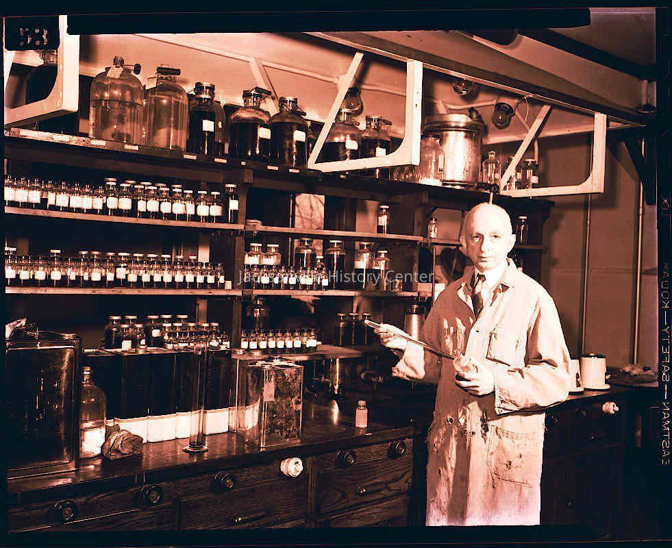Dr. Melvin DeGroote working in a chemistry lab. The envelope that contained the 4 negatives states: "Order- Tetrolite Co. Webster Groves," "Remarks- For Bob Taylor of Chemical Industries Mag."Collection