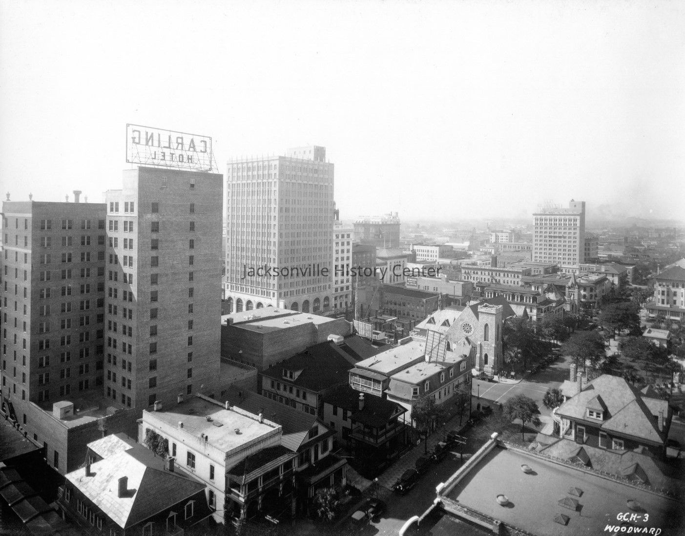 Downtown Jacksonville looking southwest, possibly standing in Rhodes-Futch-Collings Building on Main Street aerial view