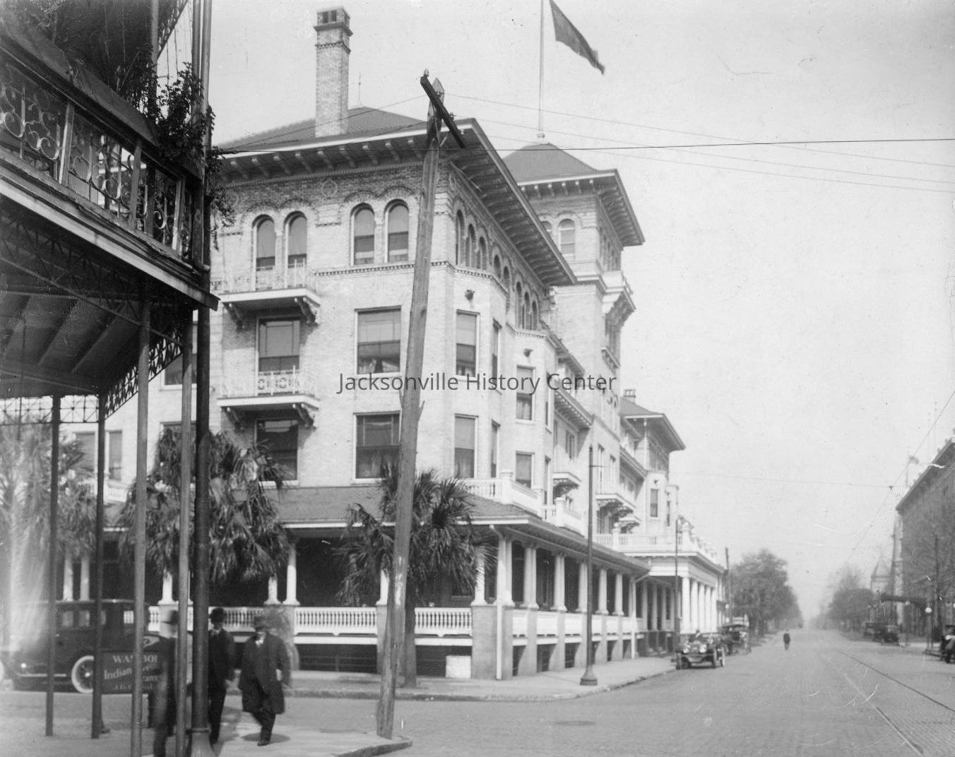 In 1885, the hotel was enlarged and it increased its capacity to 200 more guests. The building eventually extended 210 feet on Hogan, 210 feet on Monroe, 315 feet on Duval and 52 feet on Julia with accommodations for 450 guests. This building was destroyed in the Great Fire of 1901.