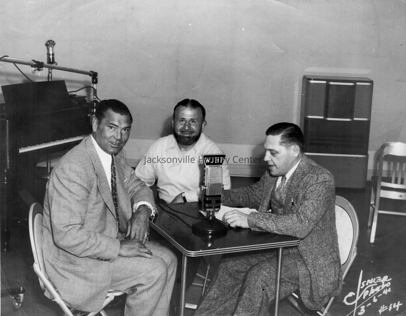 William Harrison "Jack" Dempsey (1895-1983) in Jacksonville, Florida sitting at a table with two men from radio station WJHP in 1941.