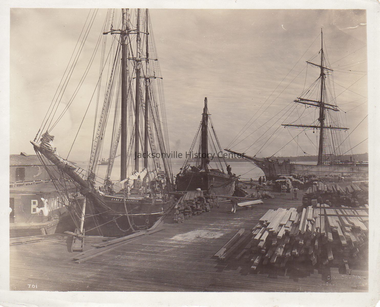 Lumber Loading Docks, Putnam Lumber Co., Jacksonville, with three sailing ships and a Cummer Lumber Co. barge