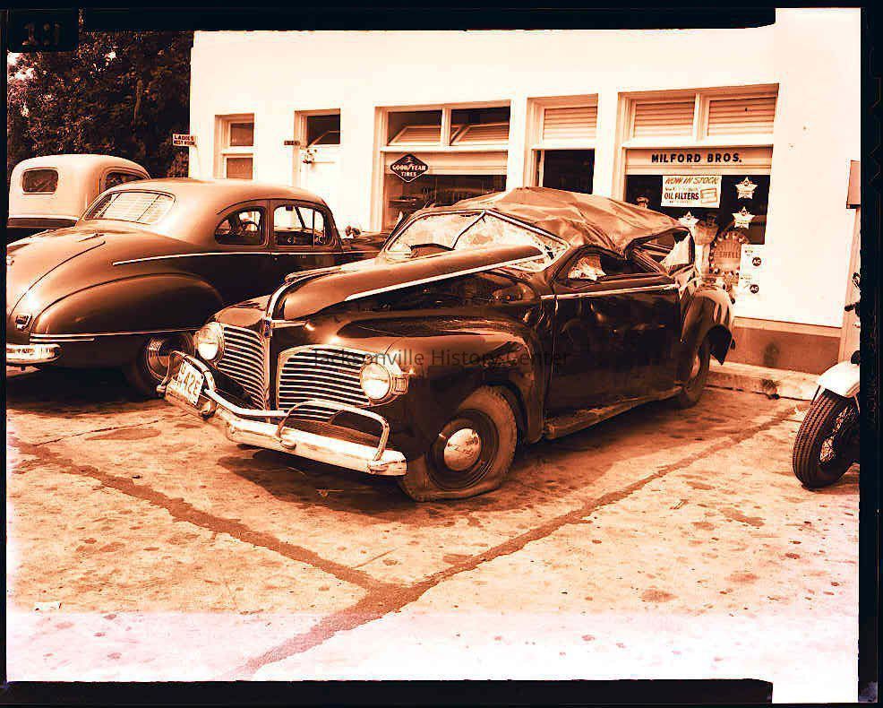 Side view of a car accident. Pictures of a car accident. The name "Cecil Howell" is handwritten on the envelope. The name "Joe Madeersky" and "1941 Dodge 2 door," and "Bob Milford" are also handwritten on the envelope. The "Milford Bros." appears in the background.Collection