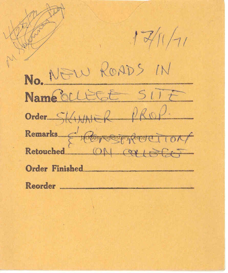 Envelope contains one negative of aerial view of new roads in college site, skinner prop. and construction on college. The envelope has "NEW ROADS IN COLLEGE SITE SKINNER PROP. & CONSTRUCTION ON COLLEGE," "4/28/72 M. Skinner Prop," (scratched out) and "12/11/71" handwritten on it. The envelope has lines for labeling: "No.", "Name," "Order," "Remarks," "Retouched," "Order Finished," and "Reorder" in printed lettering.Collection