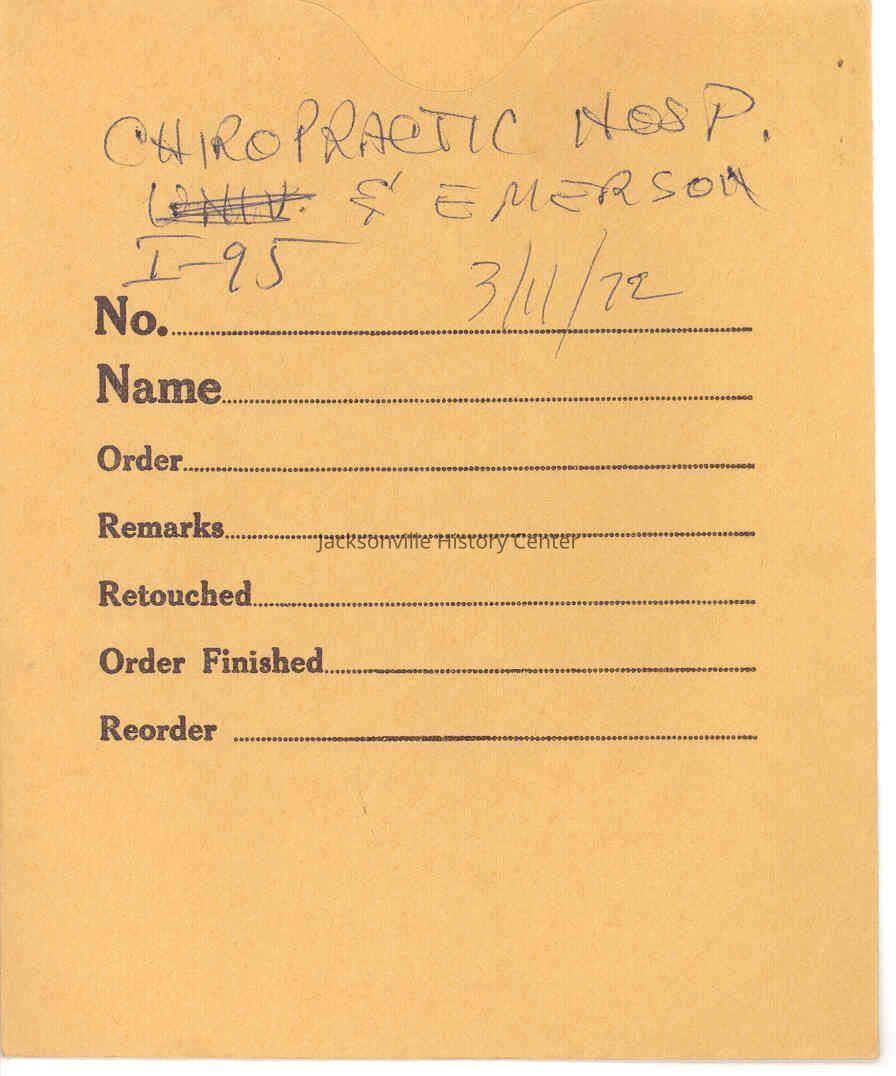The envelope has three negatives of aerials of Chiropractic Hospital at I-95 and Emerson. The envelope has lines for labeling: "No.", "Name," "Order," "Remarks," "Retouched," "Order Finished," and "Reorder" in printed lettering. It has "CHIROPRACTIC HOSP. UNIV. (crossed out) I-95 & EMERSON 3/11/72" handwritten on it.Collection