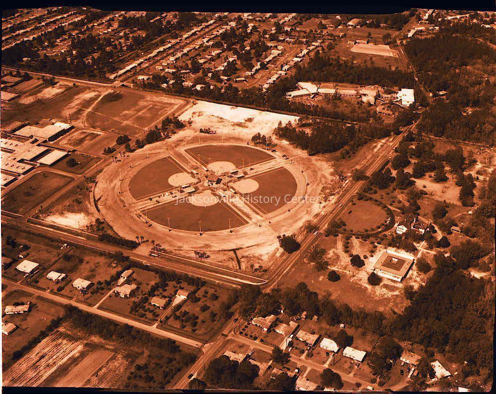 Aerial, Softball, Softball complex, Parental Home Road, Roads, Intersections, Sports facilities, Weller Photograph CollectionDescription